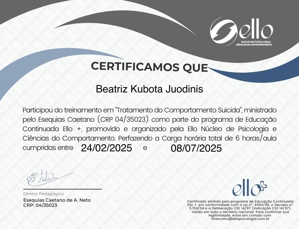 Quais são as principais especialidades de Beatriz Juodinis?Beatriz Juodinis é psicóloga. Te mostramos alguns dos serviços oferecidos pelo especialista graças à sua trajetória e vasta experiência: Psicoterapia online, Psicoterapia, Primeira consulta psicologia.