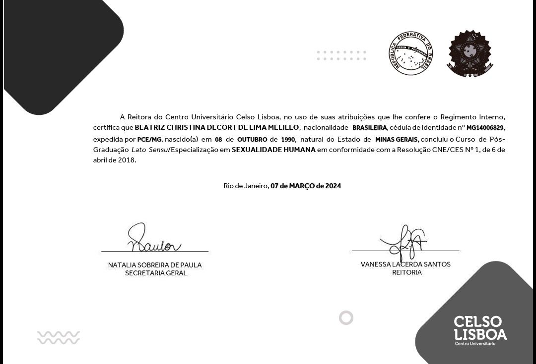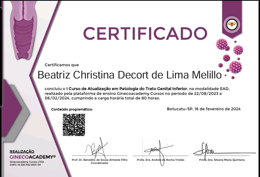 Concluí pós-graduações em Sexualidade Humana pelo CBI of Miami e em Imagem da Mama pela CETRUS – São Paulo. Atualmente, sou pós-graduanda em Ginecologia Endócrina e Docência em Saúde.