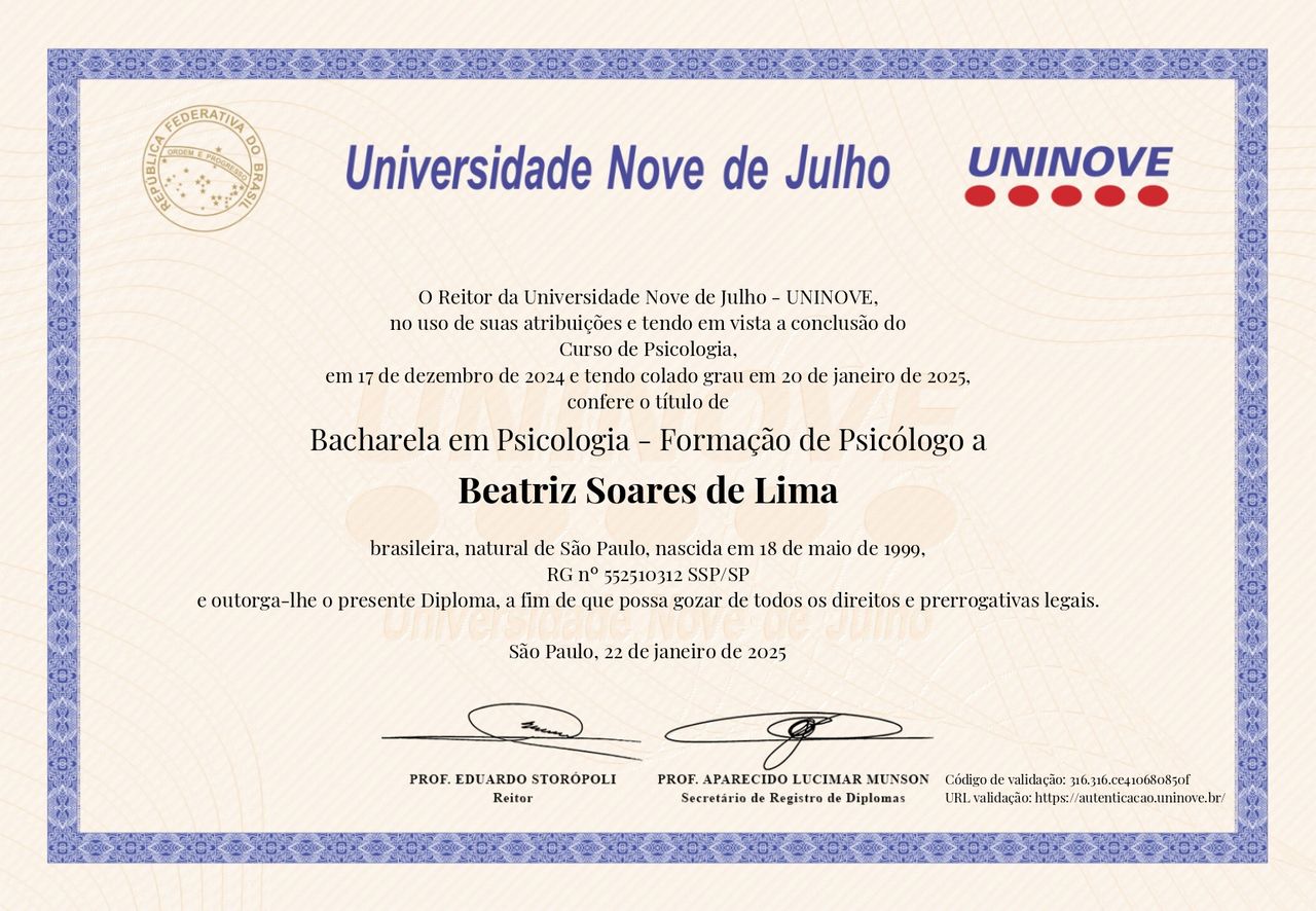 Beatriz Soares de Lima é psicóloga. Te mostramos alguns dos serviços oferecidos pelo especialista graças à sua trajetória e vasta experiência: Acompanhamento do atleta no dia da competição (suporte emocional, controle do estresse e outras intervenções), Acompanhamento psicológico para mulheres em climatério, Aconselhamento para familiares de dependentes químicos, Apoio psicológico ao luto, Atendimento a pacientes oncológicos, Atendimento em Psico-Oncologia à Crianças, Psicoterapia adulto, Atendimento psicológico à mulheres em situação de violência doméstica, Consulta de estresse pós-traumático, Consulta psicológica para mulher.