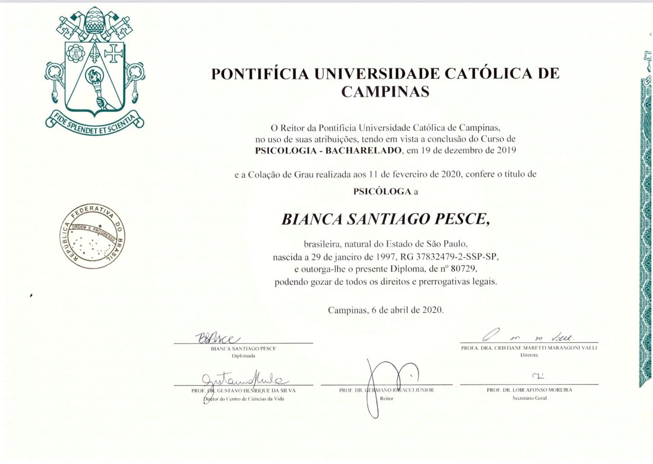 Olá! Me chamo Bianca Pesce, sou psicóloga formada pela PUC-Campinas, com formação em Terapia por Contingências de Reforçamento (ITCR-Campinas) e pós-graduanda em Neurociências e Comportamento pela FAAP.