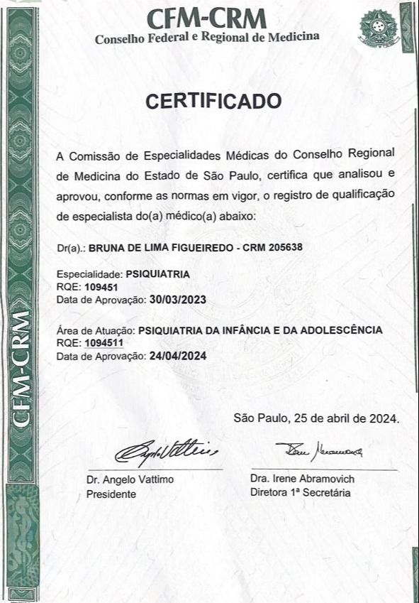 9 opiniõesDra. Bruna de Lima Figueiredo Oliveira, médica formado pela Uniara, possui uma sólida formação em psiquiatria, tendo completado sua residência médica na tradicional Faculdade de Medicina de Marília (FAMEMA). Com uma dedicação especial à saúde mental da infância e adolescência, Dra. Bruna de Lima Figueiredo aprofundou seus conhecimentos ao realizar uma subespecialização em psiquiatria da infância e adolescência na Universidade de São Paulo(USP-RP), campus de Ribeirão Preto. Além de seu enfoque na saúde mental de jovens, também realiza atendimentos a adultos, proporcionando uma abordagem abrangente no cuidado psiquiátrico. Sua trajetória acadêmica e profissional reflete um compromisso com o bem-estar emocional e psicológico de todas as faixas etárias, buscando sempre oferecer um acolhimento humanizado e uma intervenção integrada nas questões relacionadas à saúde mental.