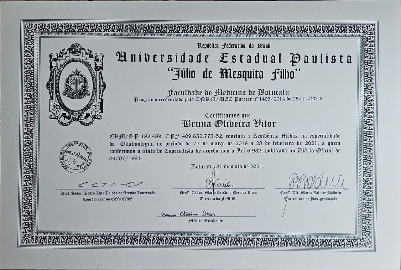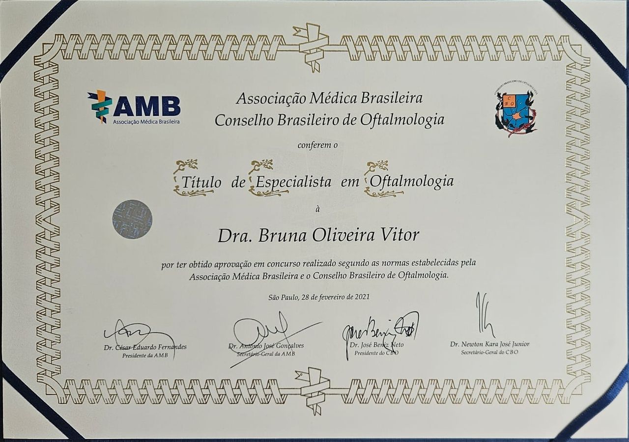 Quais são as principais especialidades de Bruna Oliveira Vitor?Bruna Oliveira Vitor é oftalmologista. Te mostramos alguns dos serviços oferecidos pelo especialista graças à sua trajetória e vasta experiência: Consulta Oftalmologia, Primeira consulta Oftalmologia, Retorno de consultas Oftalmologia, Consulta oftalmologia (tonometria, fundo de olho e refração), Aceleração e recuperação pós cirúrgico, Acompanhamento da saúde do Idoso, Acompanhamento pós operatório, Acuidade Visual, Acuidade visual com laser (PAM) - binocular, Análise e solicitação de exames.