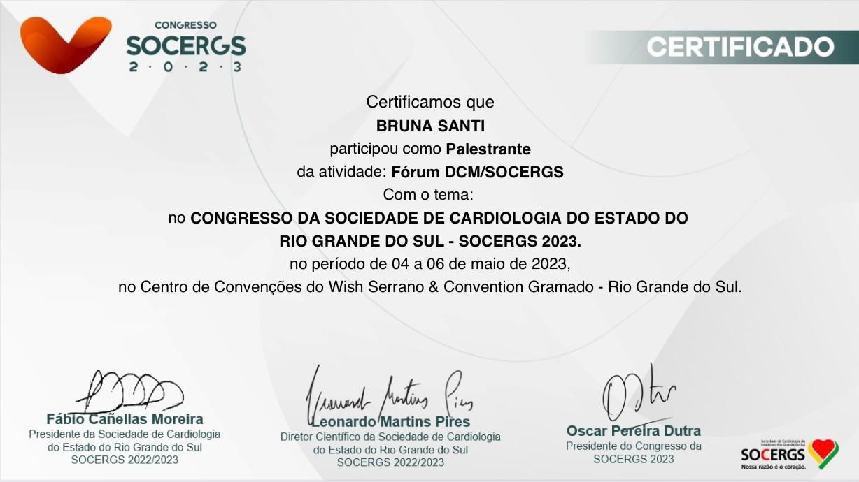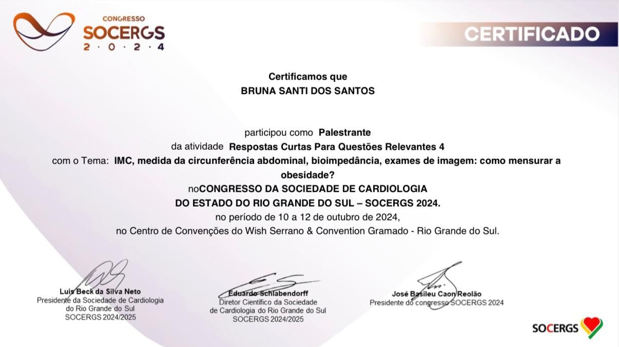 Quais são as principais especialidades de Bruna Santi?Bruna Santi é cardiologista. Te mostramos alguns dos serviços oferecidos pelo especialista graças à sua trajetória e vasta experiência: Consulta Cardiologia, Check up, Tratamento de obesidade, Avaliação pré-operatória, Avaliação cardiológica para atletas, Primeira consulta Cardiologia, Cardiogeriatria, Tratamento para Hipertensão, Avaliação do perfil lipídico (colesterol / triglicérides), Acompanhamento pós infarto.