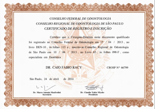 Quais são as principais especialidades de Caio Fabio Racy?Caio Fabio Racy é dentista. Te mostramos alguns dos serviços oferecidos pelo especialista graças à sua trajetória e vasta experiência: Primeira consulta Odontológica, Extração do siso, Clareamento dental caseiro, Consulta Odontológica, Protese de Porcelana, Consulta de retorno, Placa miorrelaxante, Prótese sobre implantes, Placa de mordida para bruxismo, Lente de contato dental.