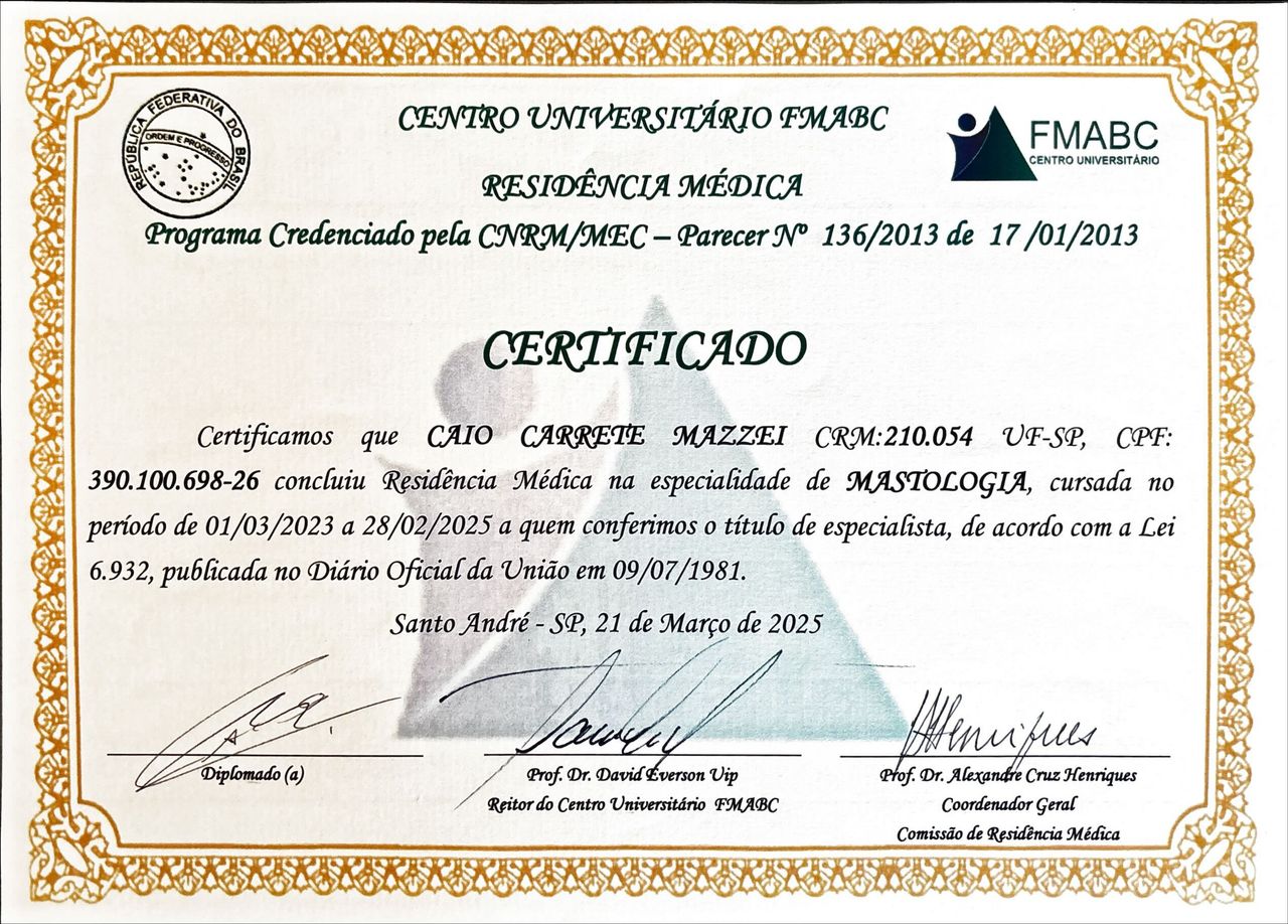 Médico formado pela Faculdade de Medicina do ABC, especialista em Mastologia, Ginecologia e Obstetrícia pela mesma instituição.