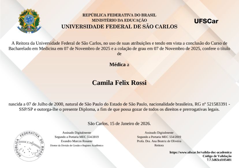 Sou formada pela UFSCar, universidade referência em ensino médico no Brasil, e trago comigo a experiência de quem atuou na linha de frente dos maiores hospitais de São Carlos (HU-UFSCar e Santa Casa).