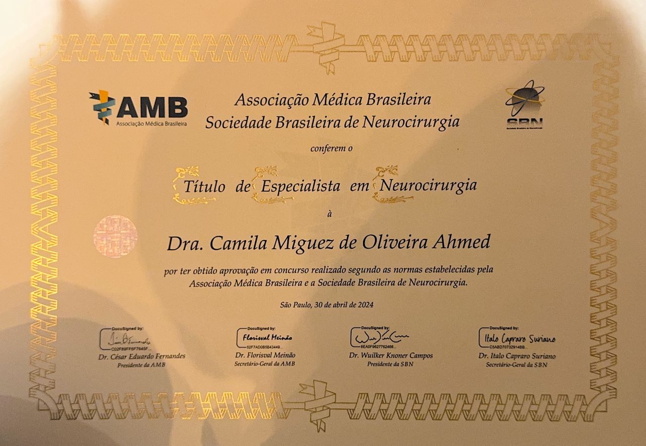 Dra. Camila Miguez de Oliveira Ahmed é médica neurocirurgiã formada pelo Instituto Estadual do Cérebro Paulo Niemeyer, onde também se especializou em neurocirurgia pediátrica por meio de fellowship reconhecido pela Sociedade Brasileira de Neurocirurgia Pediátrica, sob a mentoria do Dr. Gabriel Mufarrej. Complementou sua formação com um fellowship observacional no renomado Great Ormond Street Hospital, em Londres, onde teve excelente reconhecimento por sua atuação. Com ampla experiência, atende tanto crianças quanto adultos, e já integrou equipes de sobreaviso em instituições de referência no Rio de Janeiro. Atualmente, é responsável pela neurocirurgia pediátrica do Hospital Federal de Bonsucesso e do Hospital Municipalizado Adão Pereira Nunes, além de se dedicar a consultas e cirurgias eletivas no Centro Médico Américas e em Icaraí - Niterói. Dra. Camila é reconhecida não apenas por sua técnica cirúrgica precisa e exemplar, mas também por seu perfil acolhedor, oferecendo acompanhamento integral, com atenção às dúvidas dos pacientes e disponibilidade para contato contínuo.