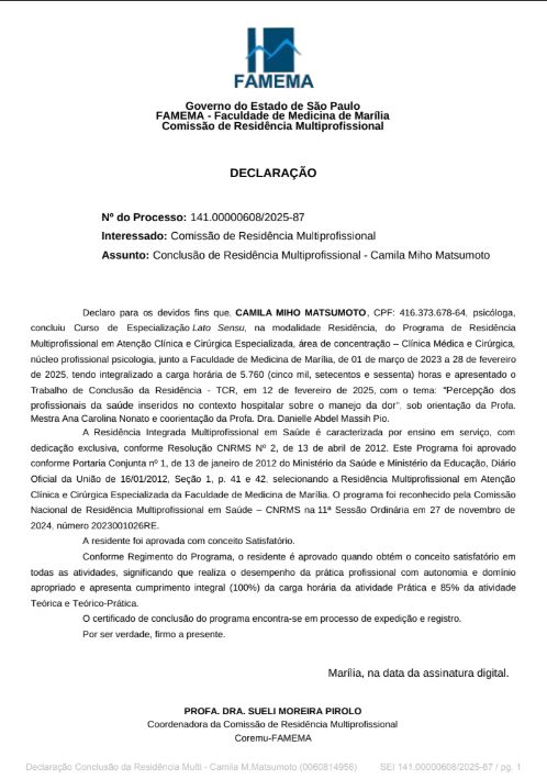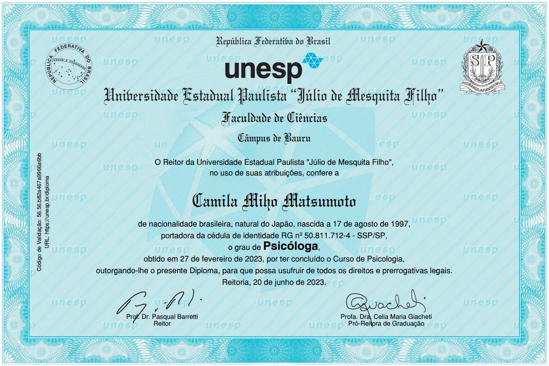 Sou formada em Psicologia pela Universidade Estadual Paulista "Júlio de Mesquita Filho" (UNESP) com residência no programa de Atenção Clínica e Cirúrgica Especializada pela Faculdade de Medicina de Marília (FAMEMA) e, atualmente, realizo mestrado no programa Ciências da Saúde e Comunicação humana na linha de pesquisa sobre o sono.