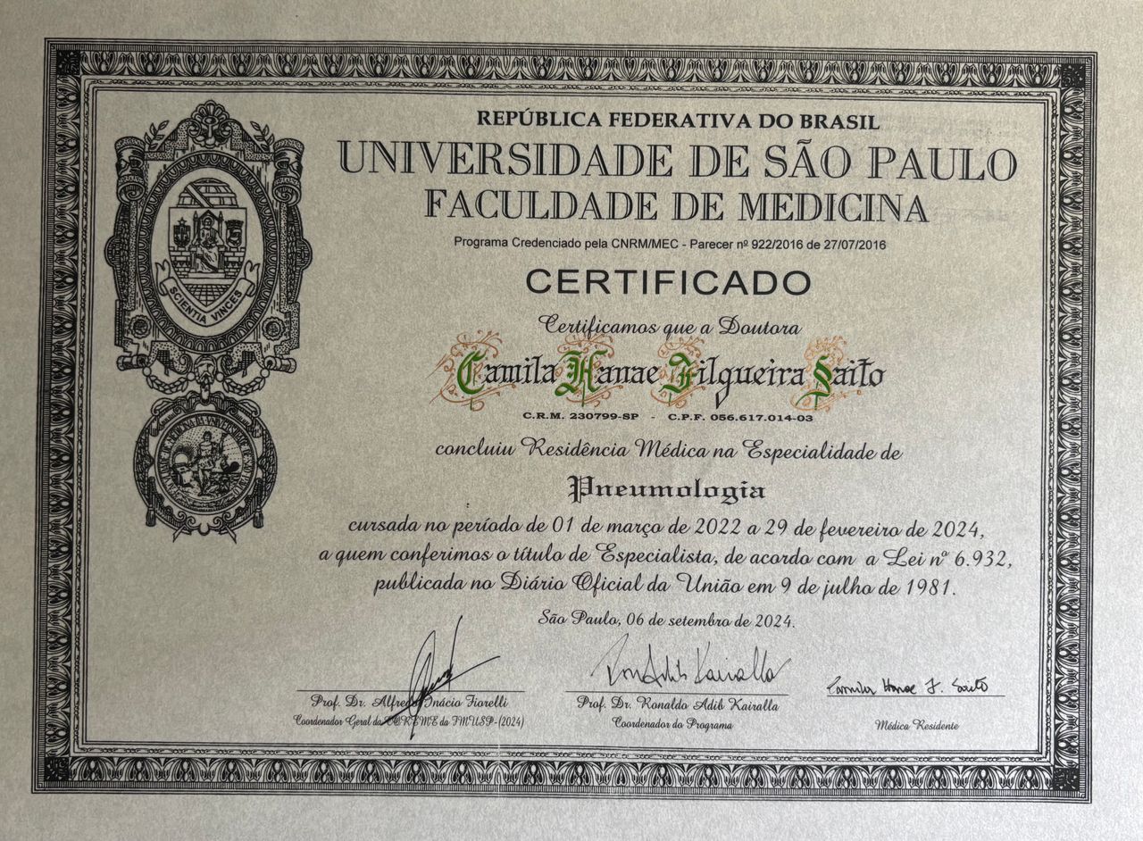 Quais são as principais especialidades de Camila Saito?Camila Saito é pneumologista. Te mostramos alguns dos serviços oferecidos pelo especialista graças à sua trajetória e vasta experiência: Primeira consulta Pneumologia, Teleconsulta, Acompanhamento de nódulo pulmonar, Consulta pneumologista adulto, Tratamento para pneumonia, Tratamento de asma, Tratamento para bronquiolite, Tratamento de bronquite.