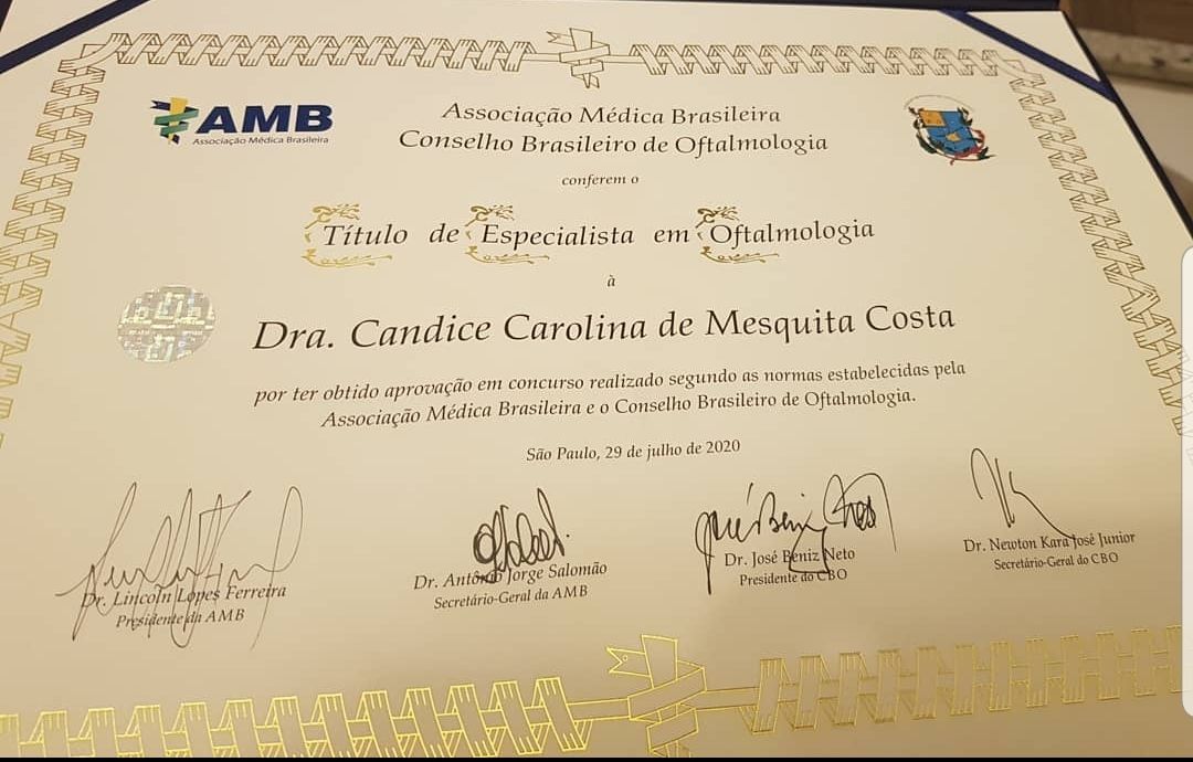 Especialização Médica em Oftalmologia pela Fundação Altino Ventura, Recife-PE (2020). Certificado de Especialista em Oftalmologia pela AMB/CBO 2020.