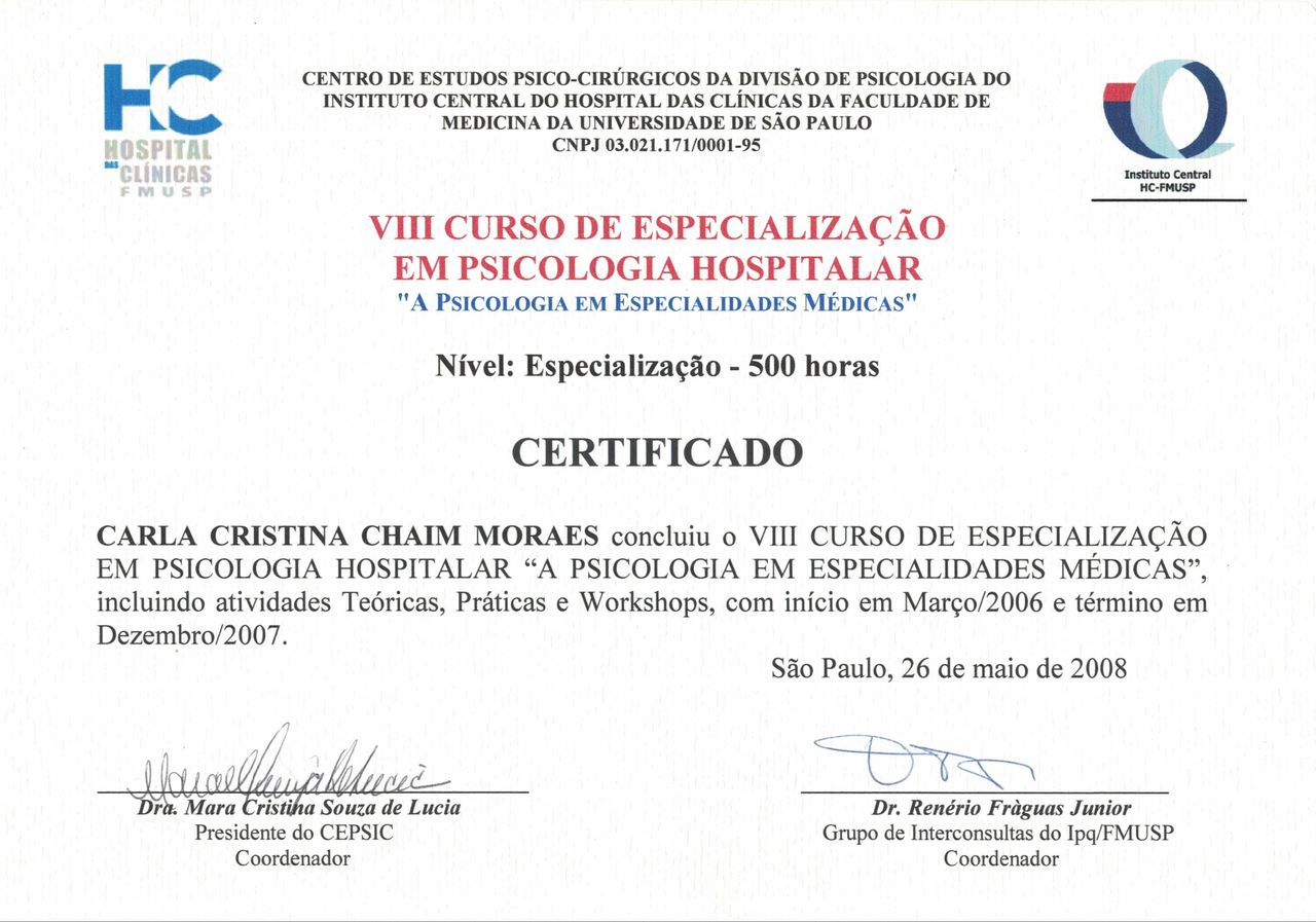 Quais são as principais especialidades de Carla Chaim?Carla Chaim é psicóloga. Te mostramos alguns dos serviços oferecidos pelo especialista graças à sua trajetória e vasta experiência: Consulta de psicologia online, Aconselhamento psicológico para dependência química, Psicoterapia adulto, Aconselhamento para familiares de dependentes químicos, Consulta psicológica do adolescente, Consulta psicológica do adulto, Psicoterapia, Tratamento da depressão, Anamnese psicológica, Psicoterapia Psicanalítica.