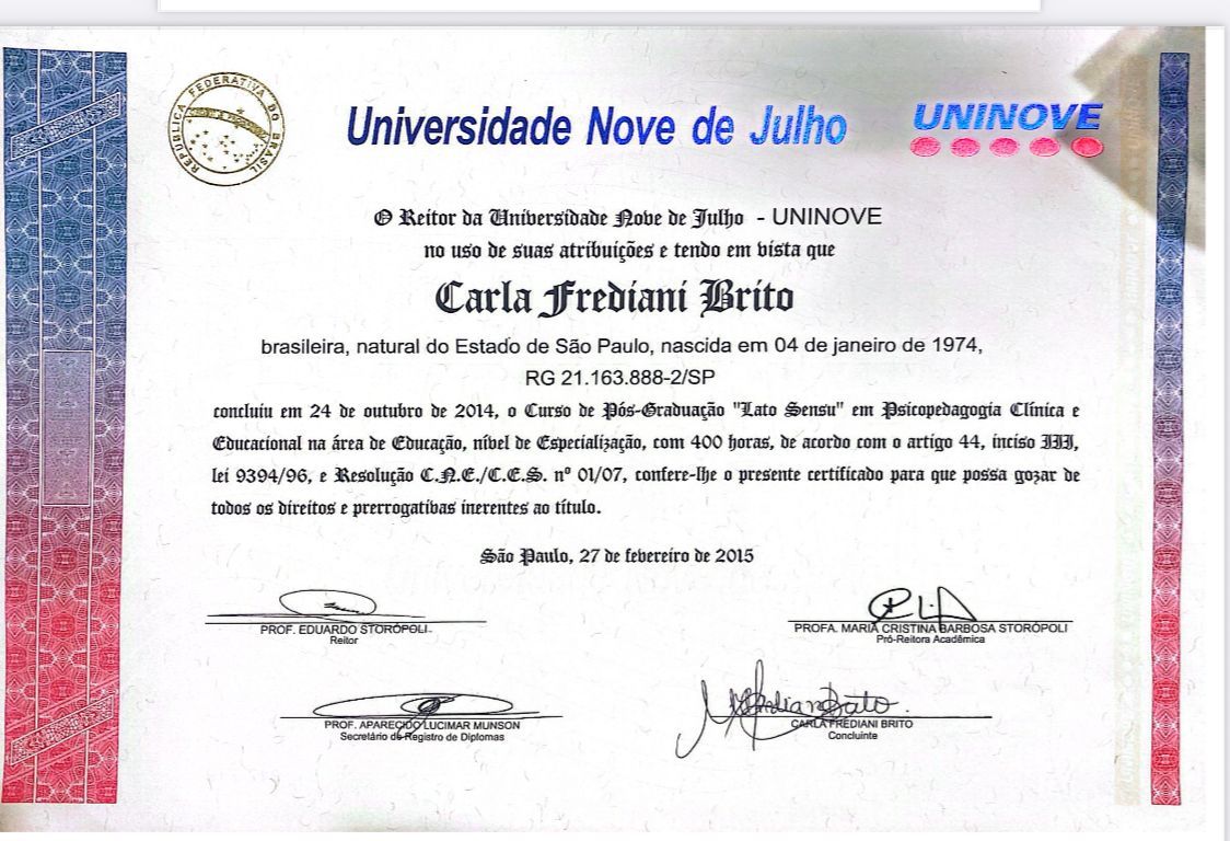 Quais são as principais especialidades de Carla Frediani Brito?Carla Frediani Brito é psicopedagoga. Te mostramos alguns dos serviços oferecidos pelo especialista graças à sua trajetória e vasta experiência: Primeira consulta Psicopedagogia, Análise e solicitação de exames, Psicodiagnóstico, Consulta Psicopedagogia, Apoio Psicopedagógico, Teleconsulta.