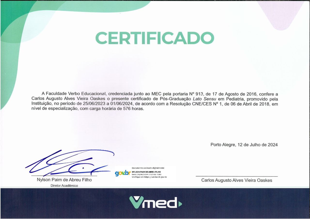 Quais são as principais especialidades de Carlos Augusto Vieira?Carlos Augusto Vieira é pediatra, médico clínico geral. Te mostramos alguns dos serviços oferecidos pelo especialista graças à sua trajetória e vasta experiência: Teleconsulta, Primeira consulta clínica médica, Atendimento em saúde mental, Consulta clínico geral, Atualização de receita (renovação) de medicamentos de uso prolongado, Laudo médico.