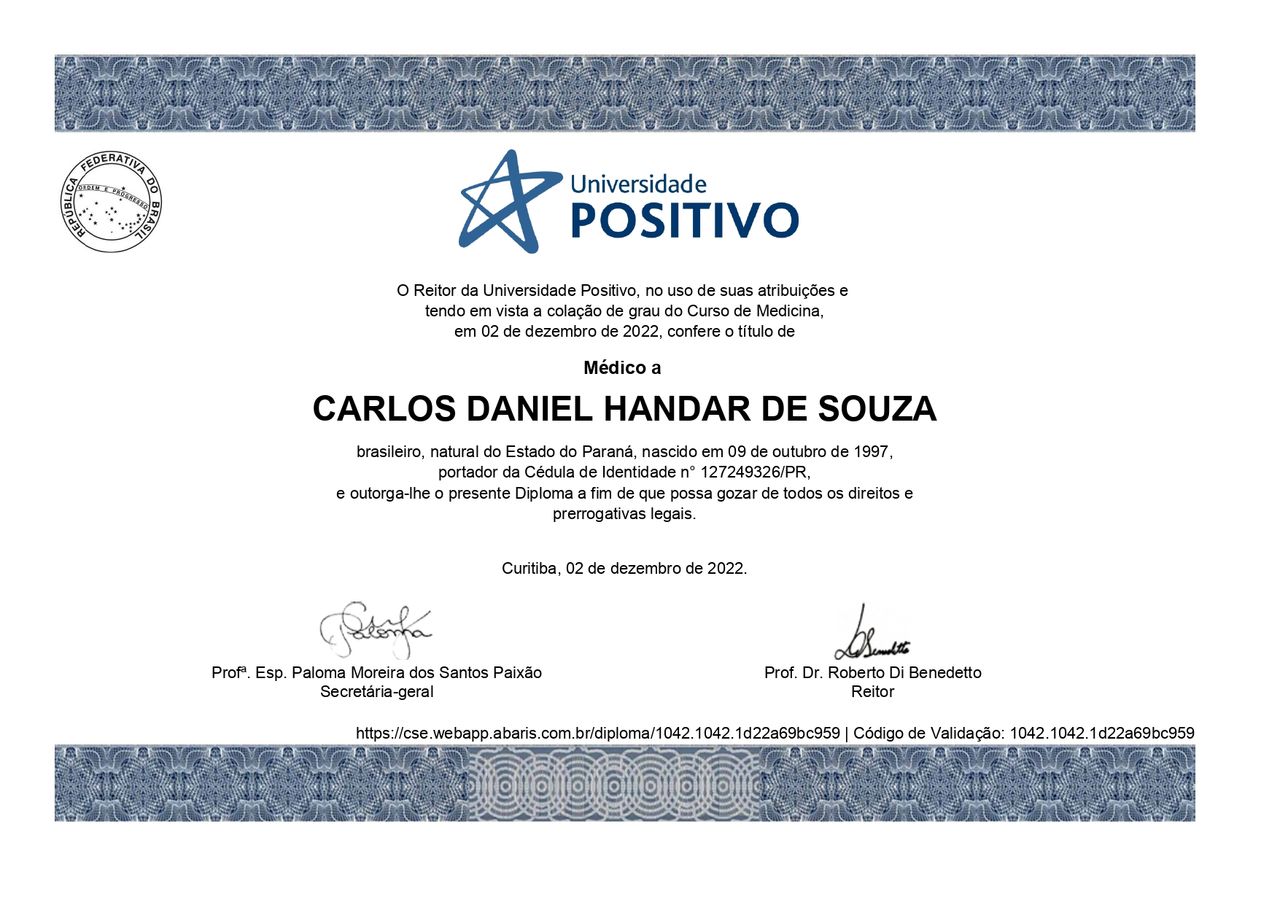 Quando poderia me consultar com Carlos Daniel Handar de Souza?Carlos Daniel Handar de Souza costuma ter horários disponíveis dentro da mesma semana ou para a semana seguinte. Verifique o calendário: você verá o primeiro horário disponível, atualizado em tempo real. Caso o horário sugerido não funcione para você, verifique outras datas. Agendar uma consulta é sempre imediato e gratuito.