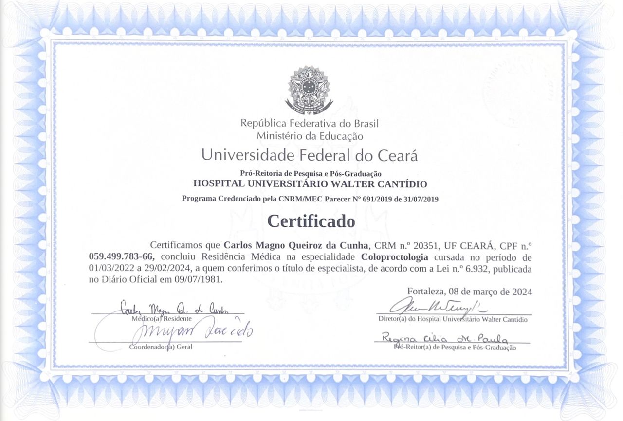 Sou Carlos Magno, Coloproctologista pela UFC, Fellowship em Portugal, Mestrado e Doutorando em Cirurgia. Ofereço terapia minimamente invasiva incluindo a colonoscopia, cirurgia por videolaparoscopia, laser anal de diodo e de CO2 para tratamento de doenças dos intestinos, reto e ânus, como fístula anal, HPV anal, hemorroida, plicoma e fissura anal.