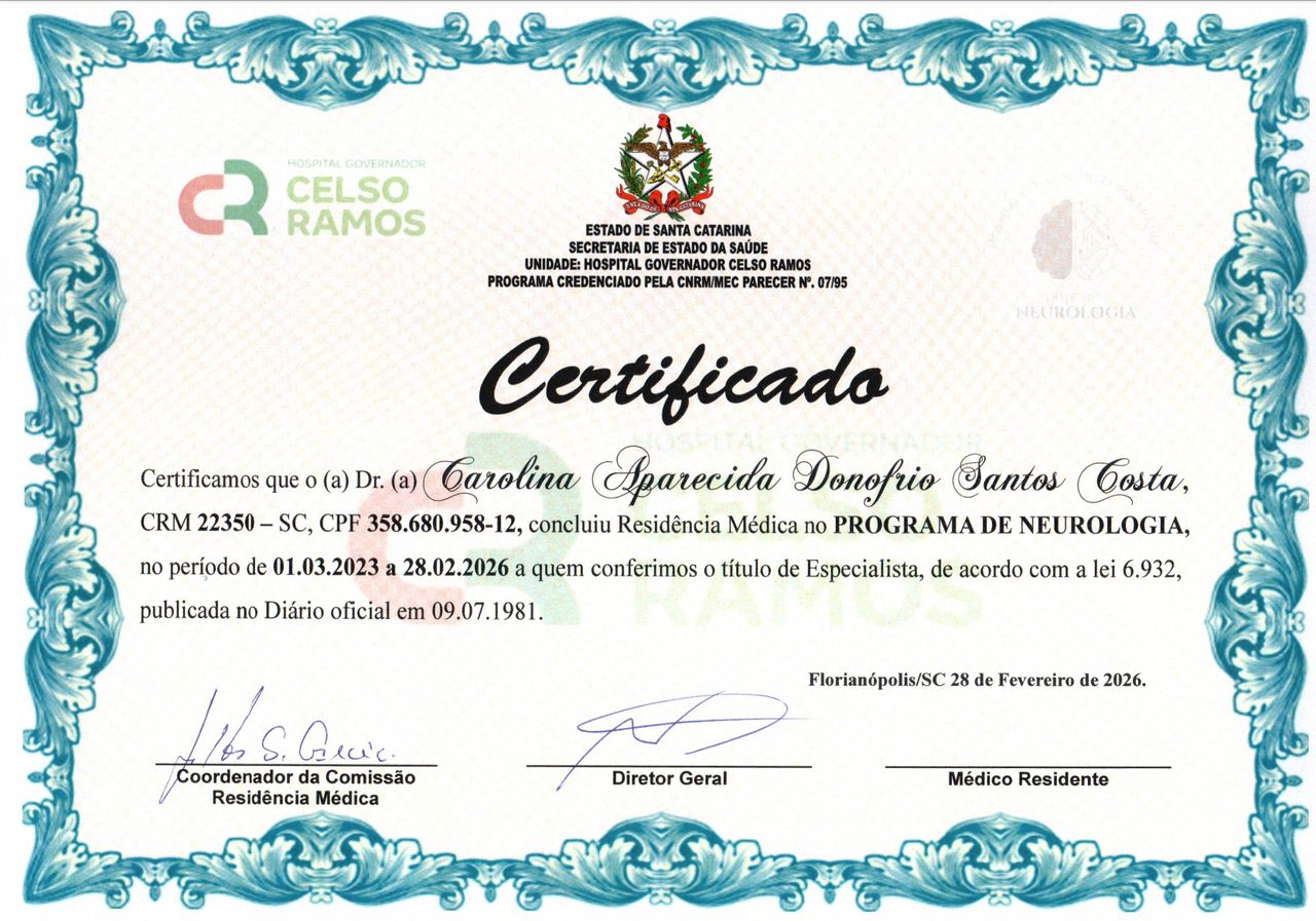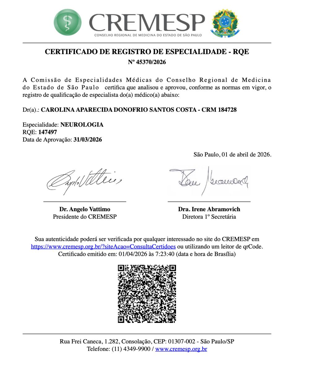 Quais são as principais especialidades de Carolina A. Donofrio S. Costa?Carolina A. Donofrio S. Costa é neurologista. Te mostramos alguns dos serviços oferecidos pelo especialista graças à sua trajetória e vasta experiência: Teleconsulta, Primeira consulta neurologia.