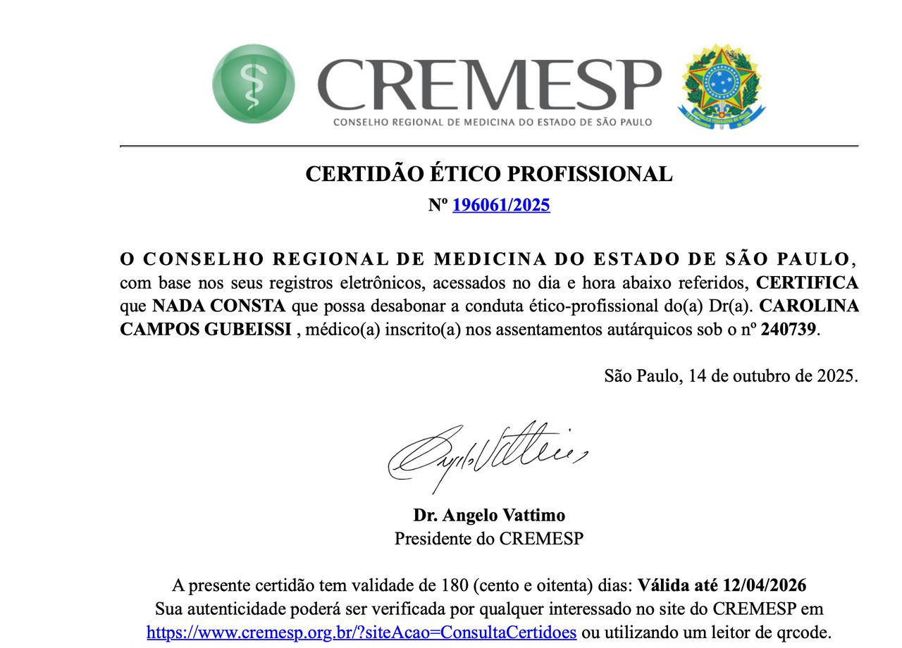 Posso passar por atendimento online com Carolina Campos Gubeissi, sem ter que ir até o consultório?Sim, Carolina Campos Gubeissi oferece atendimento online. Basta selecionar "Teleconsulta" ao agendar sua consulta e você poderá ver as datas e horários disponíveis.