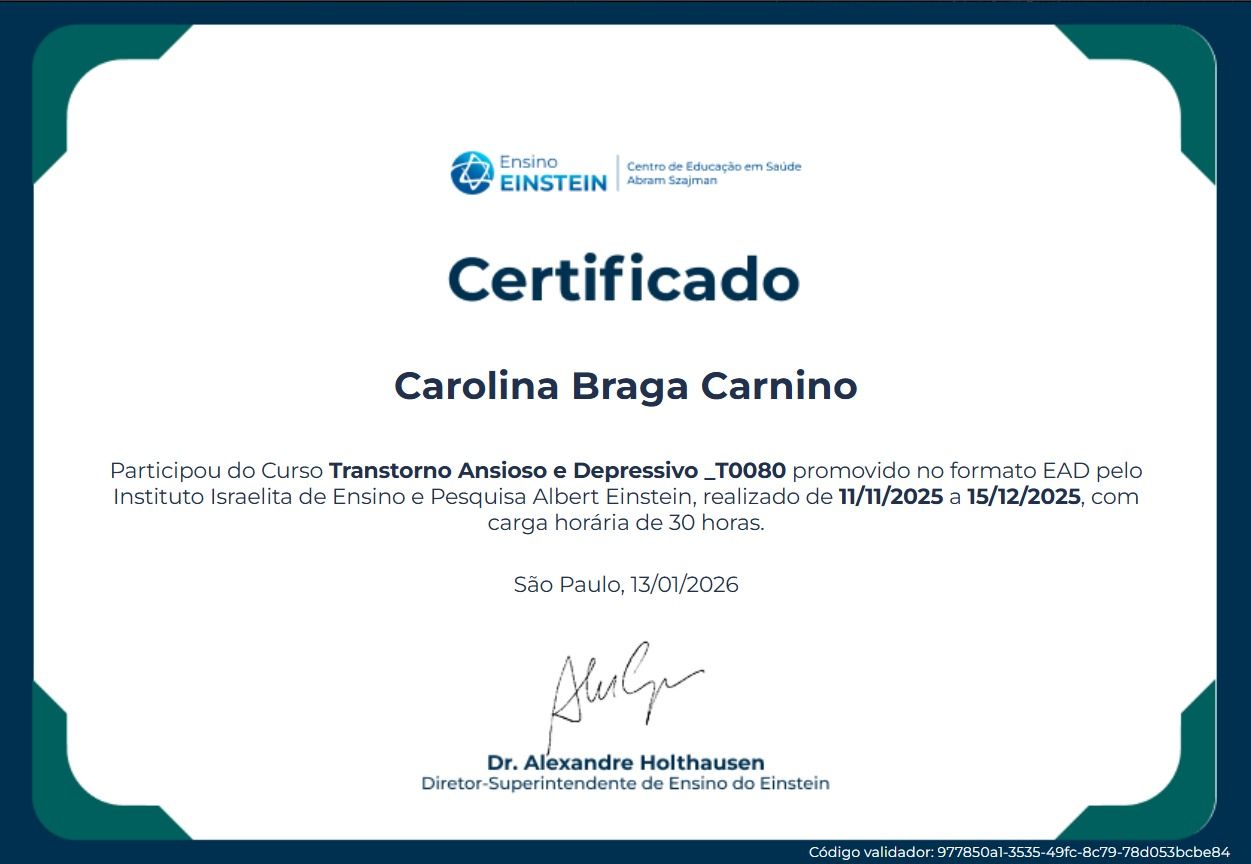 Olá! Meu nome é Carolina, sou psicóloga formada pela Universidade de São Paulo (USP). Trabalho com a Psicoterapia de Orientação Psicanalítica, atendendo jovens adultos. Meu objetivo é auxiliar meus pacientes a percorrerem suas jornadas de autoconhecimento e autocuidado. Acredito no potencial de transformação de cada pessoa e, para ajudar neste crescimento, ofereço um espaço de acolhimento, escuta e reflexão. Minha prioridade é a formação de um bom vínculo terapêutico, onde predomine a ética e a empatia. Enquanto psicóloga, já atendi demandas variadas, como ansiedade, depressão, lutos, questões de autoestima e dificuldades de relacionamento. Sempre me interessei pelo desenvolvimento humano e relações interpessoais, o que me levou a estudar a abordagem psicanalítica de Winnicott e as temáticas de família, relações amorosas e sexualidade. Recentemente concluí cursos de extensão do Hospital Albert Einstein e do Insituto de Psiquiatria do Hospital das Clínicas da USP. Busco sempre atualizar e expandir meus conhecimentos para tornar meu trabalho cada vez melhor. Convido você a conversar comigo para que possamos nos conhecer! Experiência: - Psicóloga clínica no Centro de Psicologia Aplicada (CPA) da Faculdade de Filosofia, Ciências e Letras da Universidade de São Paulo (FFCLRP-USP) - Psicóloga clínica no Serviço de Triagem e Atendimento Infantil e Familiar (STAIF) da FFCLRP-USP - Orientadora Profissional e de Carreira no CPA da FFCLRP-USP - Psicóloga Clínica particular