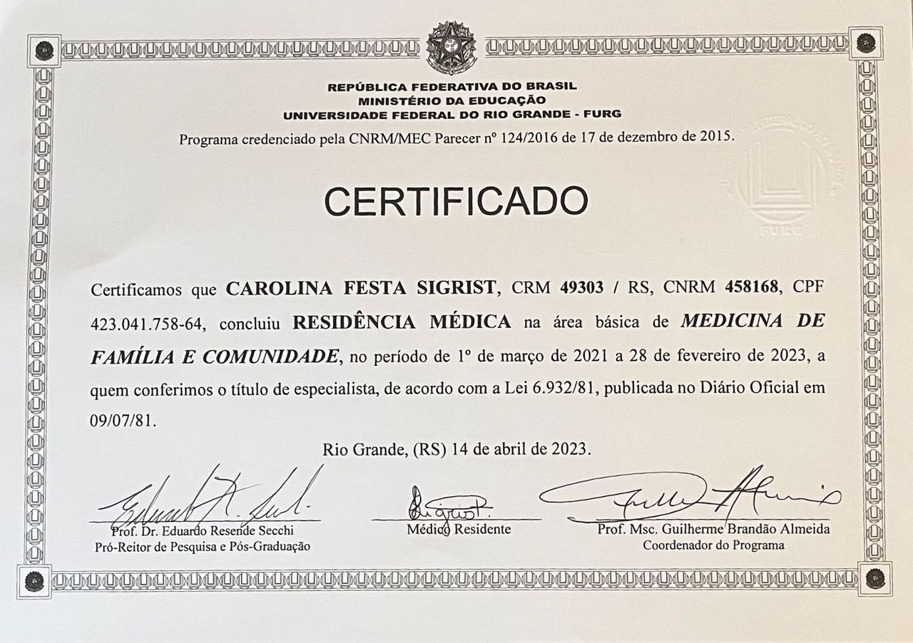 Quais são as principais especialidades de Carolina Festa Sigrist?Carolina Festa Sigrist é médica de família, generalista. Te mostramos alguns dos serviços oferecidos pelo especialista graças à sua trajetória e vasta experiência: Teleconsulta, Consulta medicina de família e comunidade, Atendimento domiciliar, Primeira consulta Medicina de Família e Comunidade, Tratamento da depressão, Tratamento de diabetes, Tratamento para Hipertensão, Tratamento da dor, Tratamento da ansiedade.