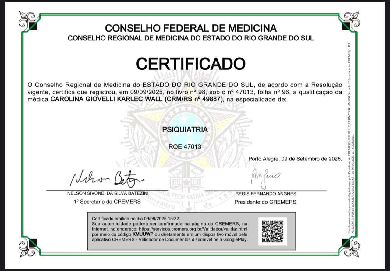 Olá! Meu nome é Carolina Giovelli Karlec Wall. Sou médica psiquiatra, com título de especialista pela Associação Brasileira de Psiquiatria.