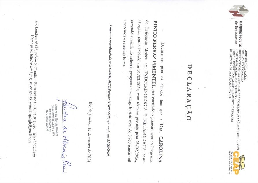 Me chamo Carolina Ferraz, sou médica com residência em Clínica Médica pela Universidade Federal do Mato Grosso do Sul e residência de Endocrinologia e Metabologia pelo Hospital Federal de Bonsucesso.