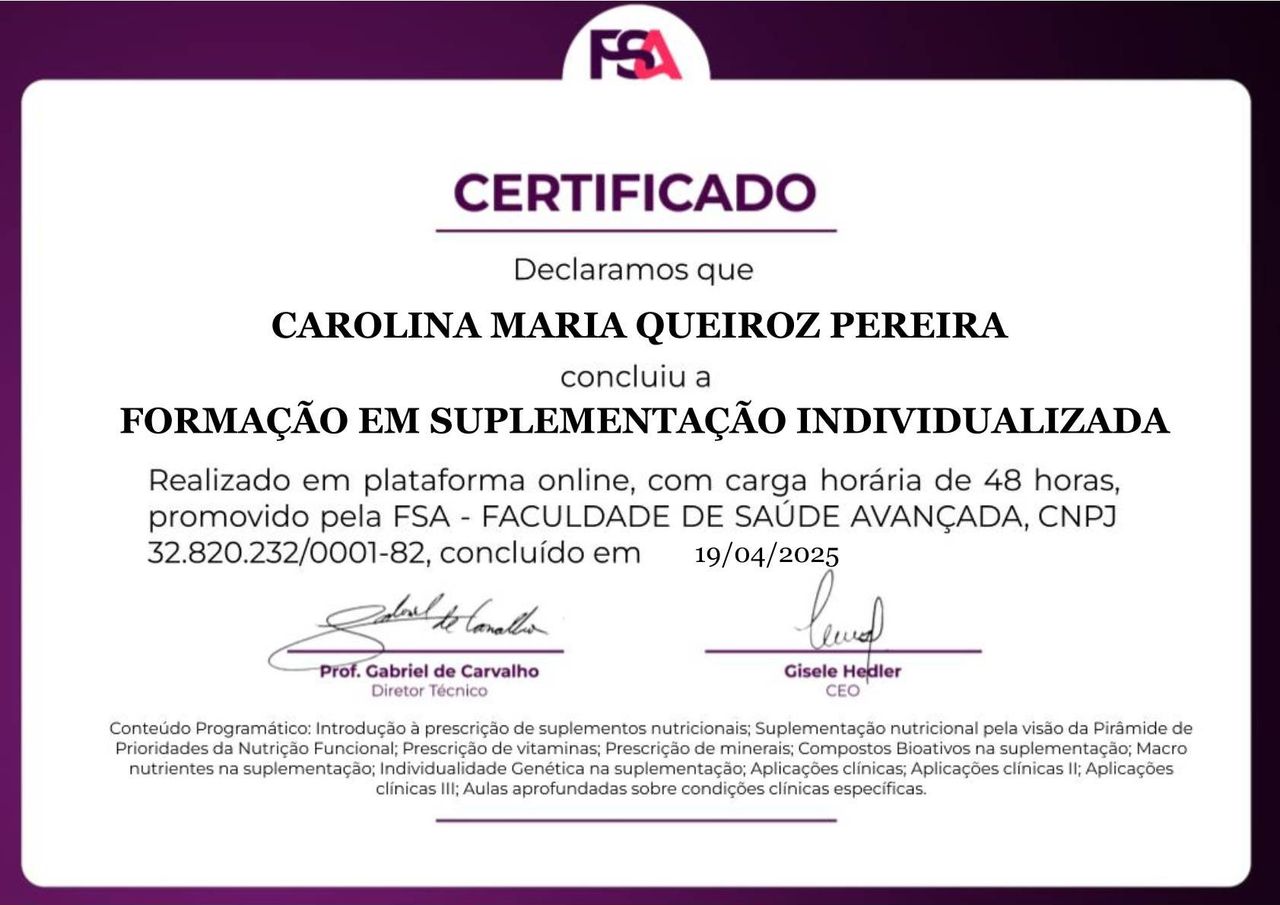 Fui atendida com muita atenção e cuidado. Dra. Carol me explicou cada detalhe e o motivo das escolhas de forma muito didática, sempre se colocando à disposição para dúvidas e suporte. Além disso, trouxe a realidade do meu dia a dia para o plano alimentar, deixando tudo mais prático e possível de seguir. Excelente profissional!