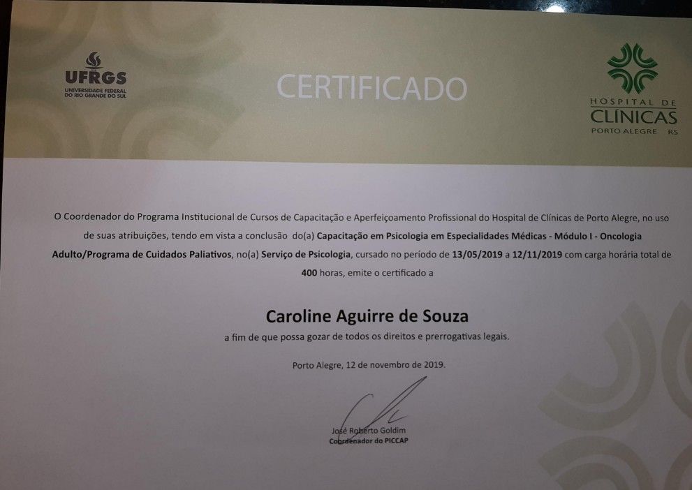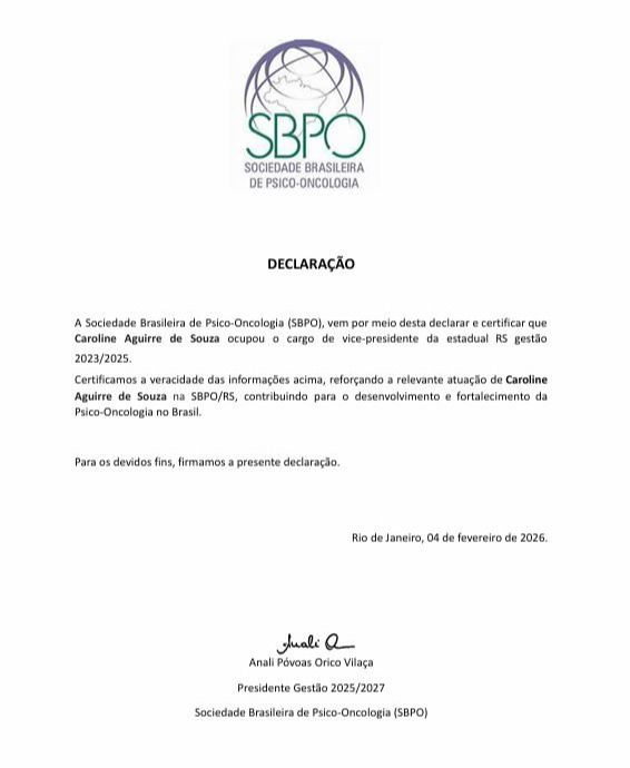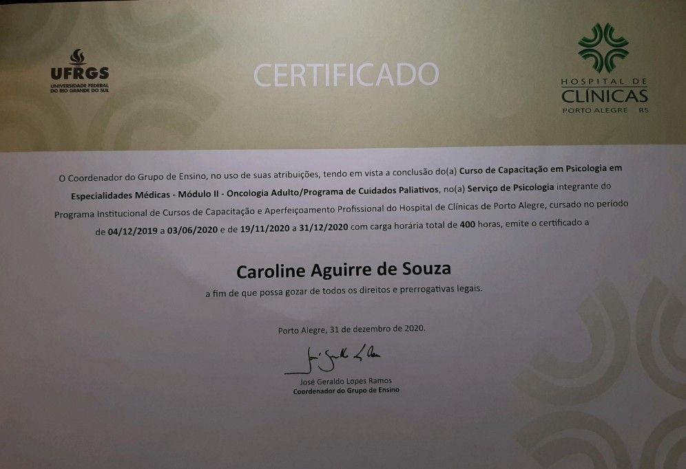 Olá, sou Caroline Aguirre, psicóloga com especialização em Psico-Oncologia e Cuidados Paliativos.