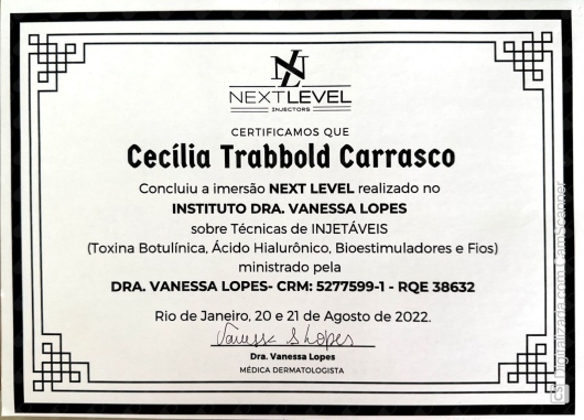 Quais são as principais especialidades de Cecilia Trabbold?Cecilia Trabbold é dermatologista, especialista em medicina estética, médica clínica geral. Te mostramos alguns dos serviços oferecidos pelo especialista graças à sua trajetória e vasta experiência: Primeira consulta Dermatologia, Peeling, Eletro Coagulacao De Lesao Cutanea, Tratamento para melasma, Peeling químico, Preenchimento facial, Dermatoscopia digital, Retirada de sinais, cistos e verrugas, Consulta médica, Cirurgia Do Xantelasma.