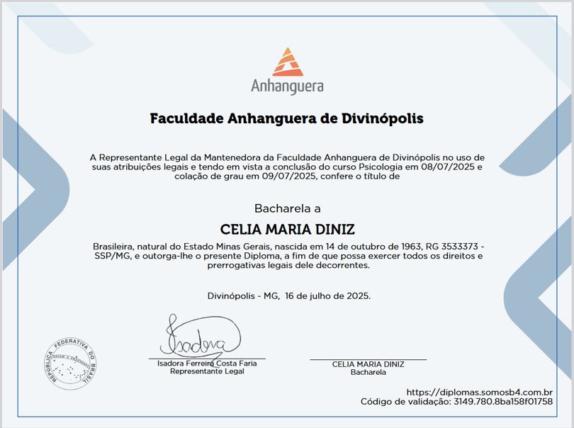 Sou Psicóloga clínica graduada pela Faculdade Anhanguera/Divinópolis (CRP 04/82016). Com formação em psicanálise e experiência no atendimento a adolescentes, adultos e idosos pela abordagem psicanalítica desde 2016. Atuação centrada na escuta ética e acolhedora, voltada para o cuidado da saúde mental e o fortalecimento da subjetividade. Comprometida com o constante aprimoramento teórico e técnico para promover transformação pessoal e bem-estar emocional.