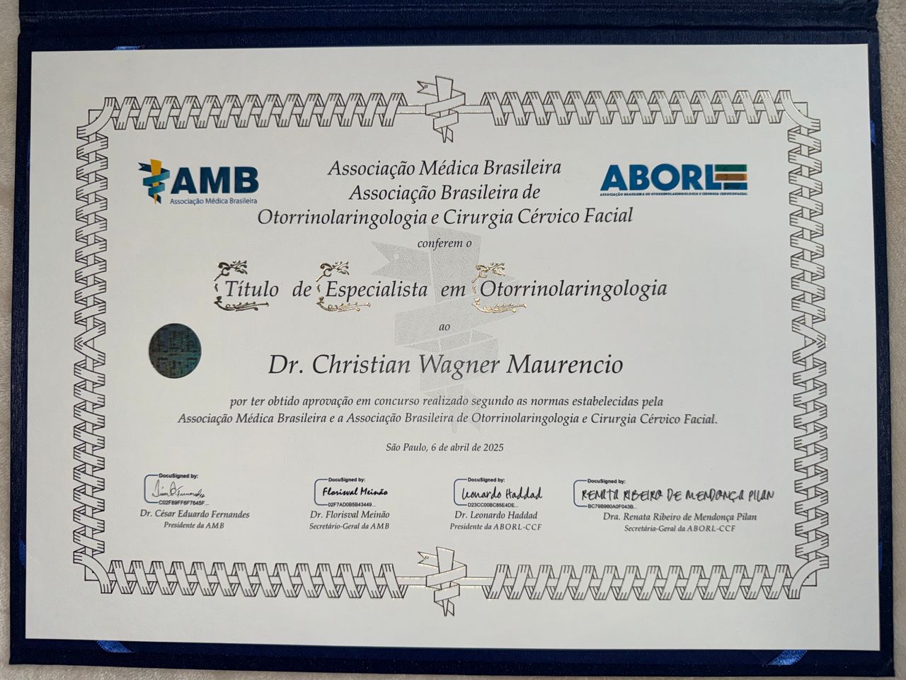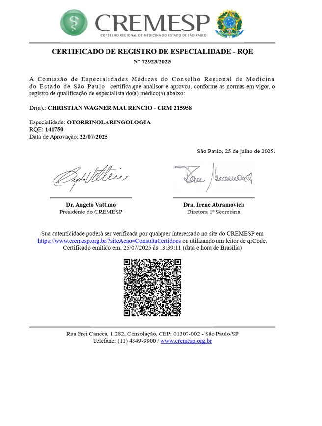 Número de registro: CRM SP 215958 - RQE Nº 141750 (otorrino)