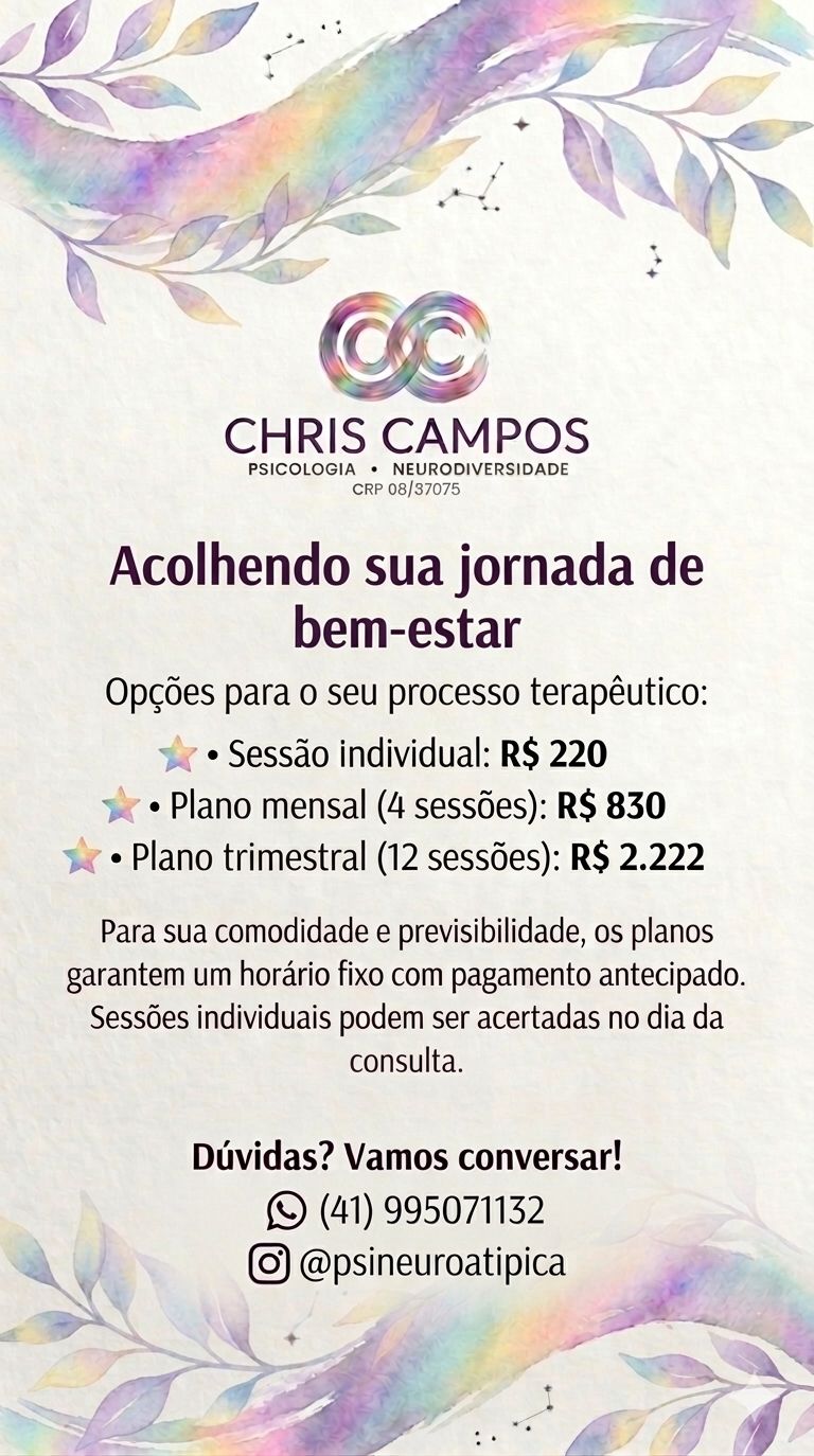 Olá! Sou Chris Campos, Psicóloga Clínica (CRP 08/37075) e mulher autista. Minha prática clínica nasce da união entre o estudo aprofundado da psicologia e a vivência pessoal da neurodivergência.