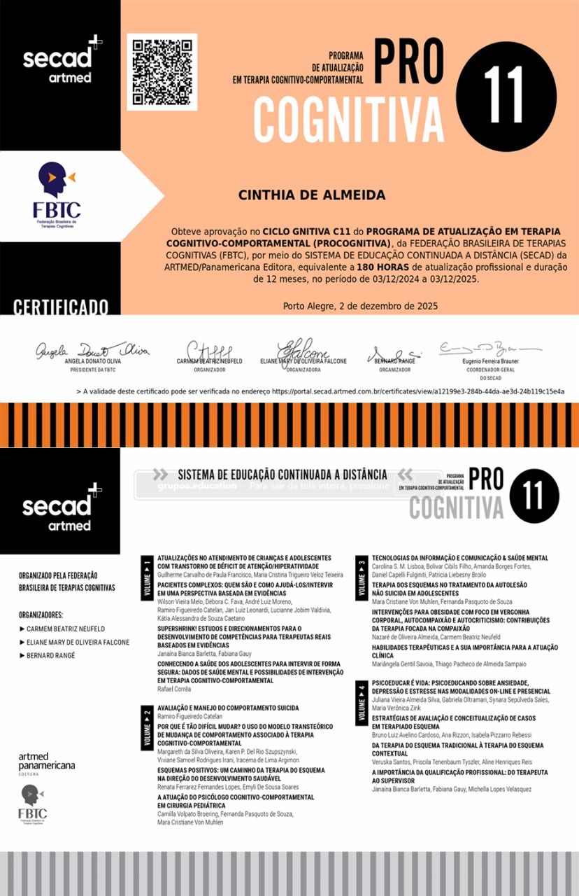 Especialista em Terapia Cognitivo ComportamentalGraduada pela Mackenzie em PsicologiaExperiência + de 14 anos na clínica psicológica