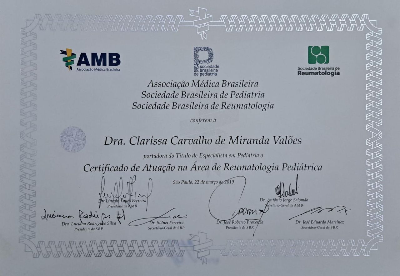 Quais são as principais especialidades de Clarissa Miranda Valões?Clarissa Miranda Valões é reumatologista pediátrico, pediatra. Te mostramos alguns dos serviços oferecidos pelo especialista graças à sua trajetória e vasta experiência: Parecer em doenças de dificil tratamento, Purpura de Henoch Shonlein, Tratamento para Doença Kawasaki, Retorno de consultas Reumatologia, Primeira consulta Reumatologia, Consulta Reumatologia, Vitamina D, Tratamento para lupus juvenil, Tratamento de miopatias inflamatórias, Tratamento para dor do crescimento.
