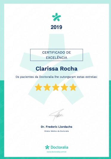 O que outros pacientes opinam sobre Clarissa Rocha?Um total de 448 pacientes já deixou uma opinião honesta e real sobre Clarissa Rocha, que tem uma avaliação média de 5 estrelas (de 5).
