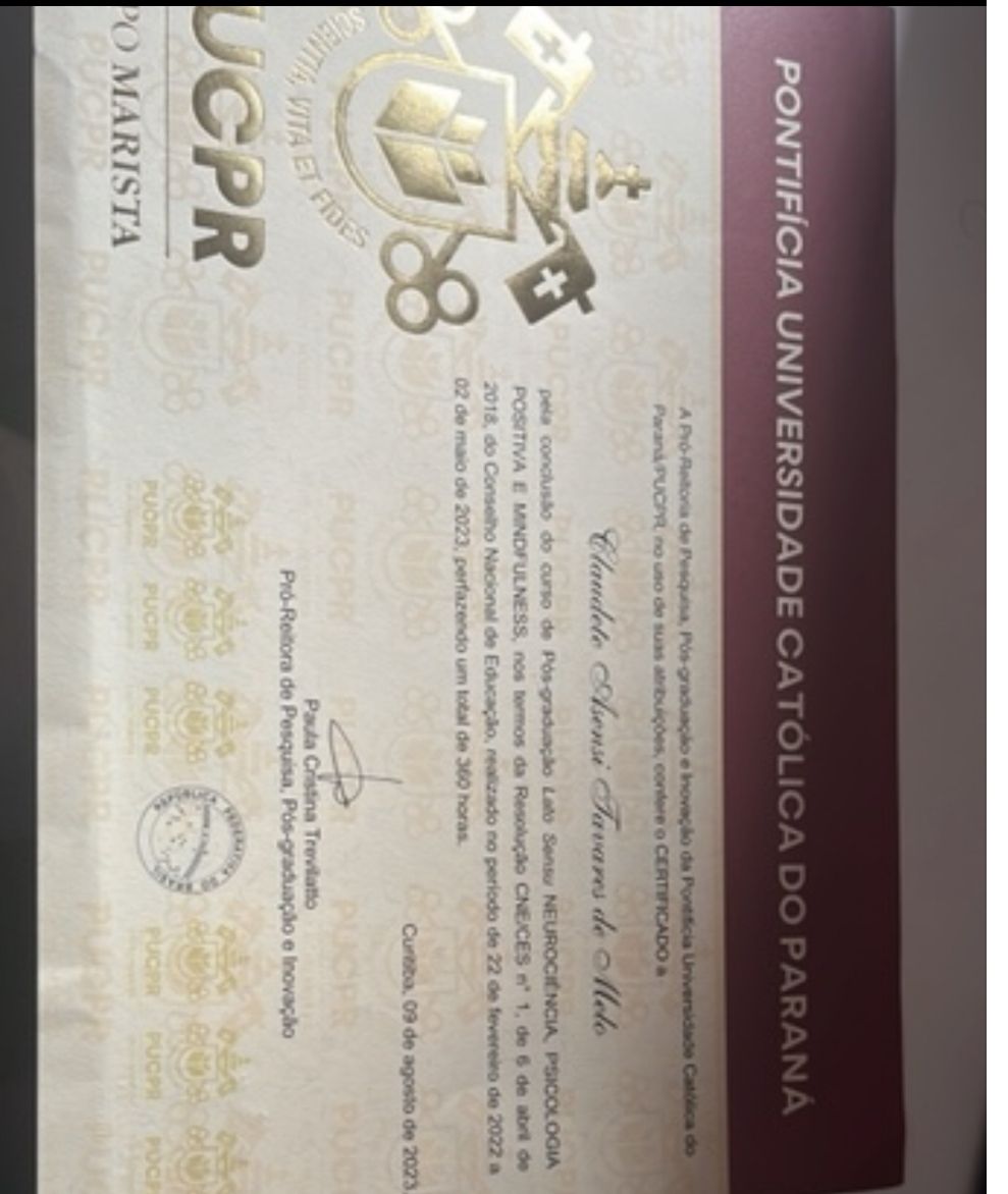 Pós Graduada em Neurociência, Psicologia Positiva pela PUC -_PR, 2023