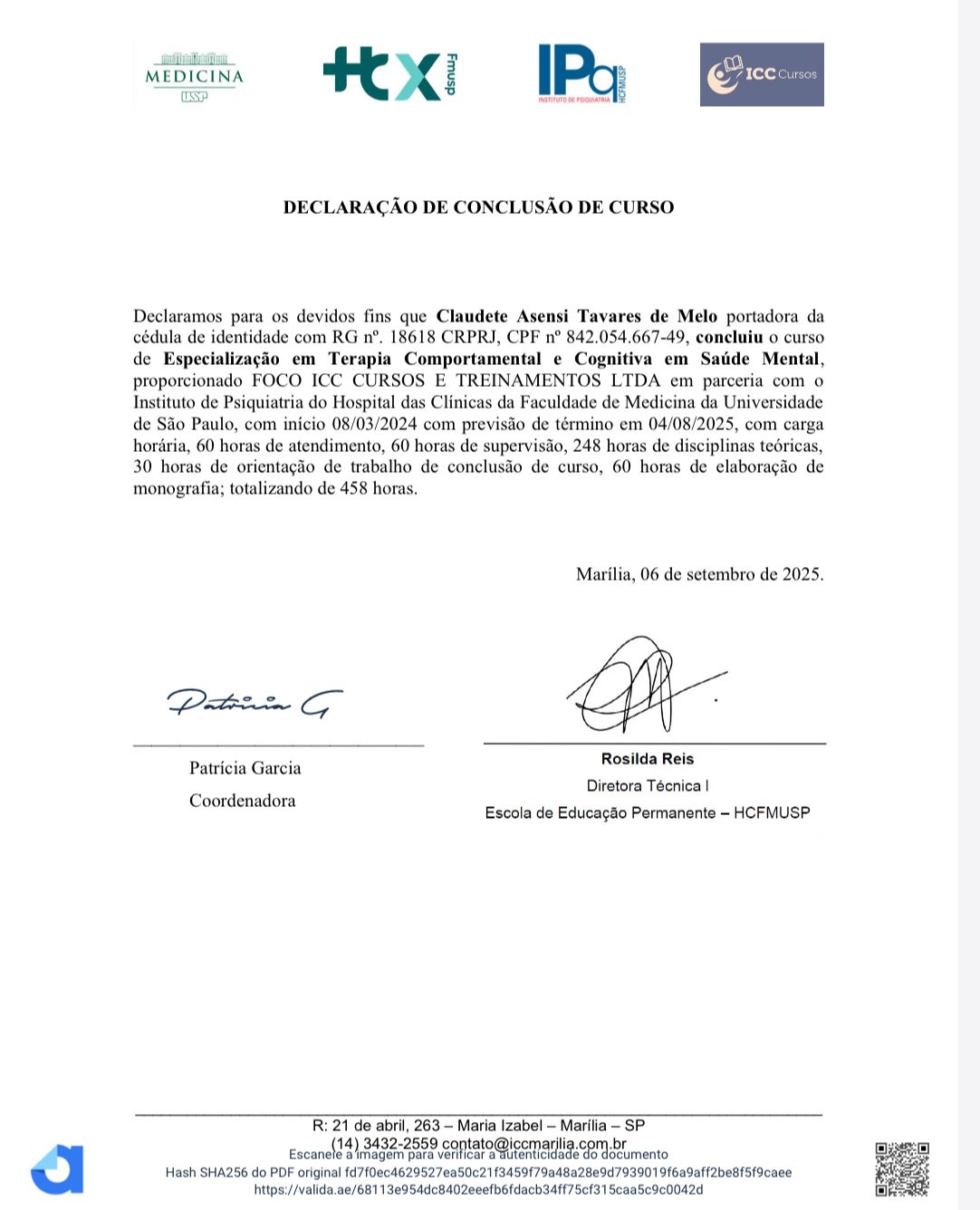 Pós Graduada em Terapia Cognitiva Comportamental em Saúde Mental pelo ICC e Hospital de Clínicas da USP, 2025