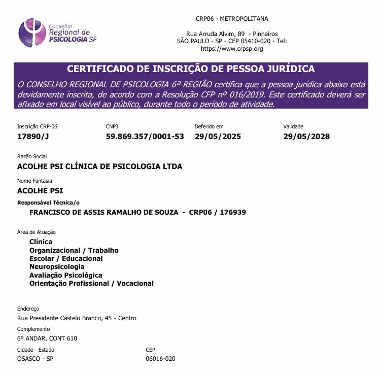 A Acolhe Psi Clínica de Psicologia foi idealizada pelo psicólogo Francisco Ramalho (CRP 06/176939), profissional atuante na área da saúde mental, pós-graduado em Terapia Cognitivo-Comportamental e Neuropsicólogo, com ampla experiência em psicologia clínica e compromisso ético com o cuidado integral ao ser humano.