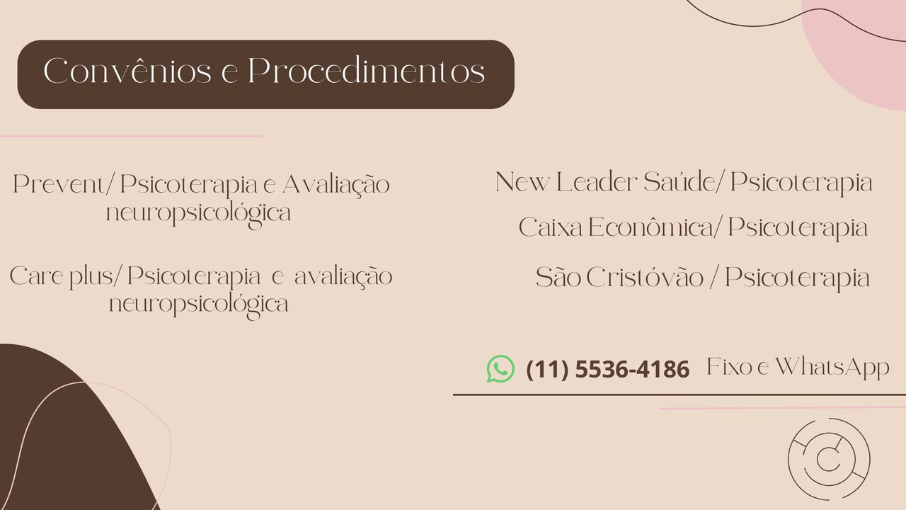 Care Plus, AFPESP, CAASP, Prevent Senior, Saúde Caixa, São Cristóvão, BLUE, Interclínicas, LEADER, além de atendimentos particulares.