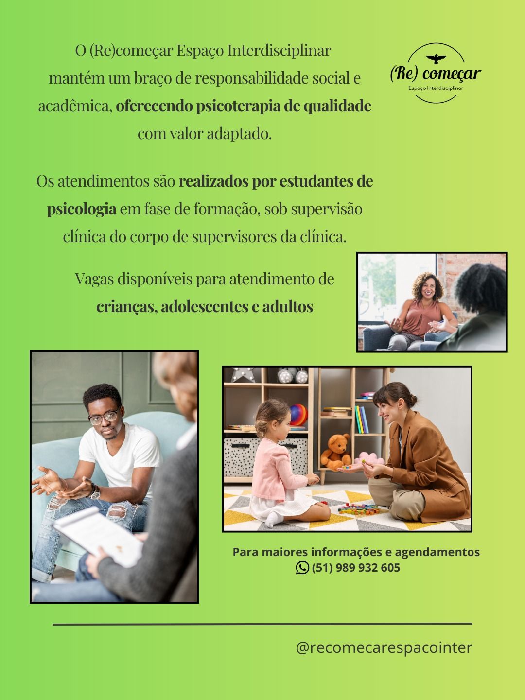O (Re)começar Espaço Interdisciplinar mantém um braço de responsabilidade social e acadêmica, oferecendo psicoterapia de qualidade com valor acessível, mediada por estudantes de psicologia em fase de formação.