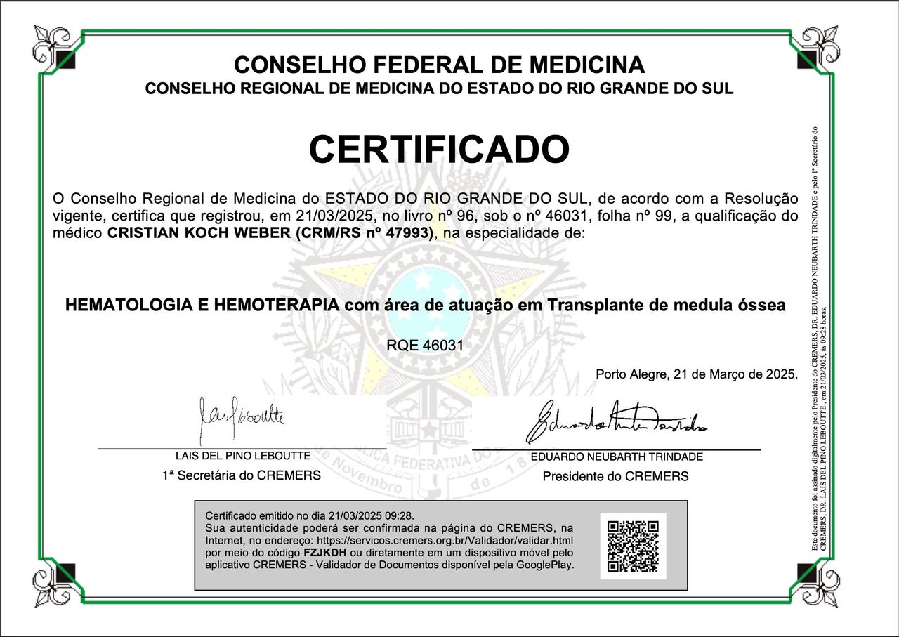 Sou Cristian Koch Weber, médico especializado em Hematologia, Hemoterapia e Transplante de Medula Óssea, com experiência em Medicina Interna e manejo de pacientes críticos em Unidades de Terapia Intensiva. Meu trabalho é focado no atendimento especializado e humanizado, abrangendo diagnóstico, tratamento e acompanhamento de doenças hematológicas, tanto benignas quanto malignas. Valorizo uma abordagem integrada, que alia conhecimento técnico a uma comunicação clara e educativa, assegurando que o paciente compreenda cada etapa do processo diagnóstico e terapêutico. Meu objetivo é oferecer cuidado de excelência, promovendo reabilitação e qualidade de vida.