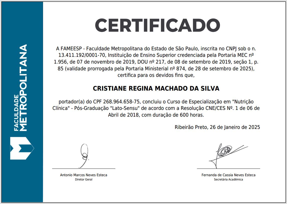 Quais são as principais especialidades de Cristiane da Silva?Cristiane da Silva é nutricionista. Te mostramos alguns dos serviços oferecidos pelo especialista graças à sua trajetória e vasta experiência: Teleconsulta, Orientação nutricional, Consulta de nutrição, Bioimpedância, Consulta nutricionista.