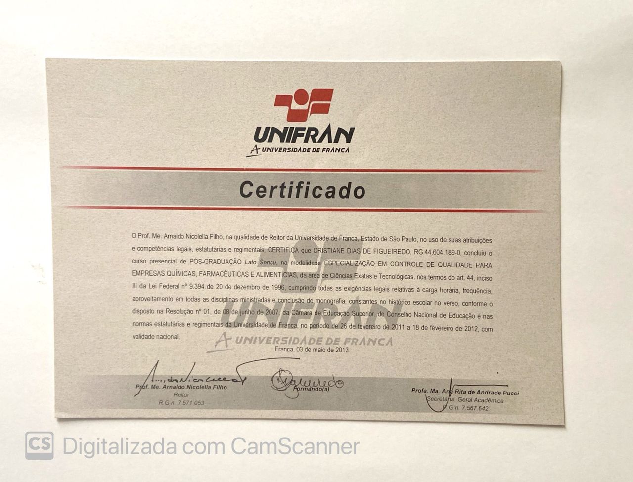 – Pós-graduação em Controle de Qualidade para Indústrias Químicas, Farmacêuticas e Alimentícias