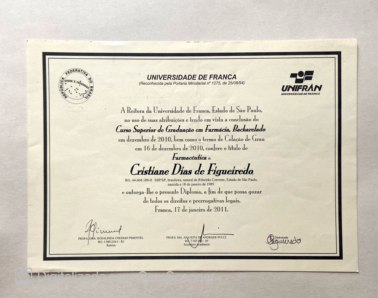 – Graduação em Farmácia (Unifran/SP), com Prêmio Dr. Clóvis Eduardo Pinto Ludovice