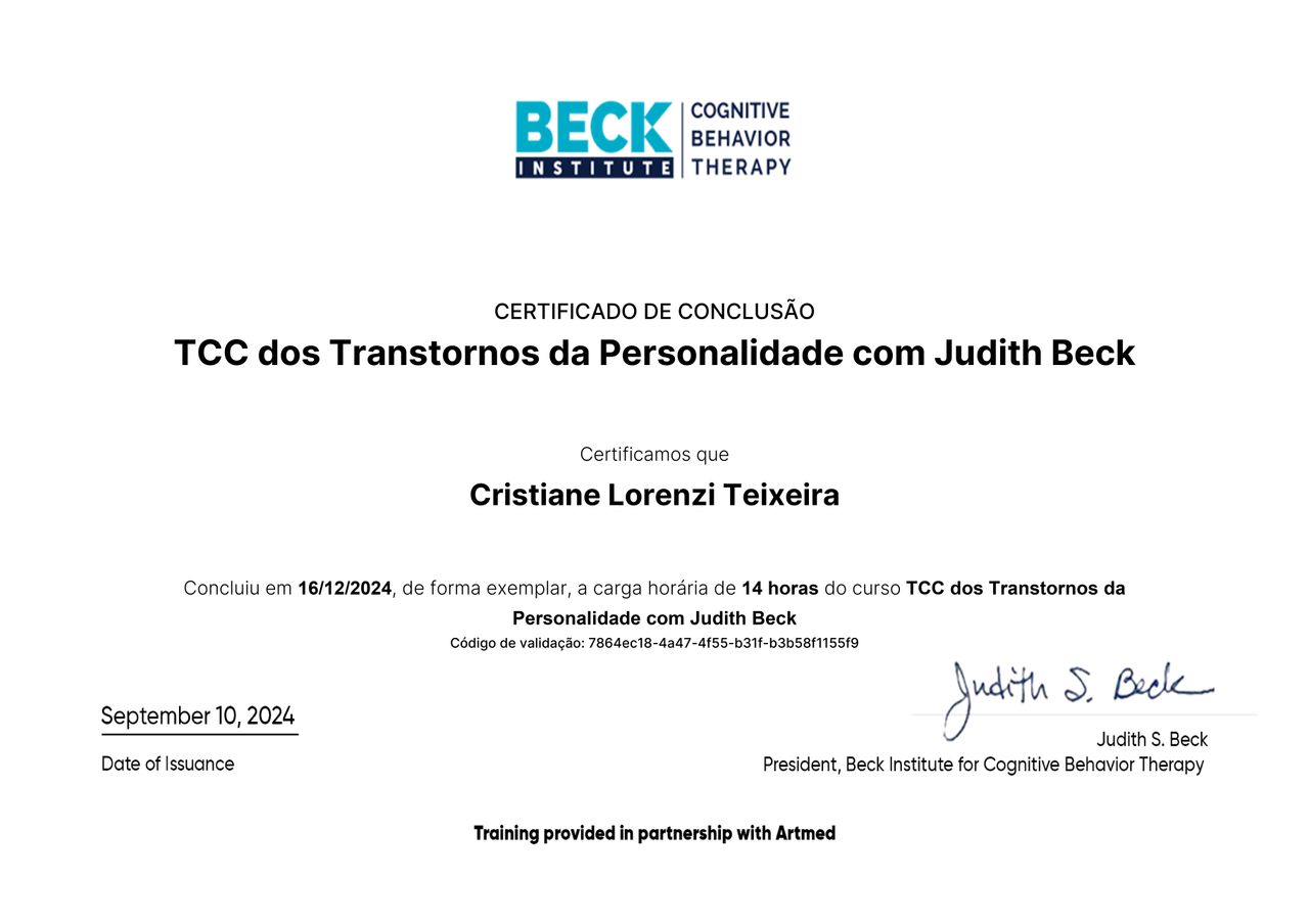 9 opiniõesOlá, sou psicóloga formada com especialização em Transtornos de Comportamento e Terapia Cognitivo-Comportamental pelo Beck Institute (referência mundial). Tenho mais de 25 anos de experiência com comportamento humano, gestão de pessoas e escuta ativa de histórias que pedem acolhimento e transformação.