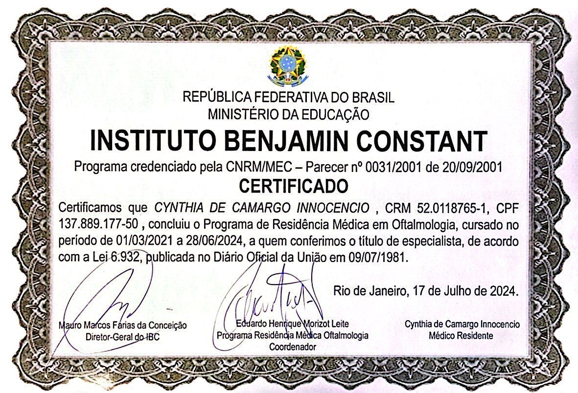 Médica formada pela Universidade de Vassouras em 2020 e Oftalmologista formada pelo Instituto Benjamin Constant, no Rio de Janeiro, em 2024.