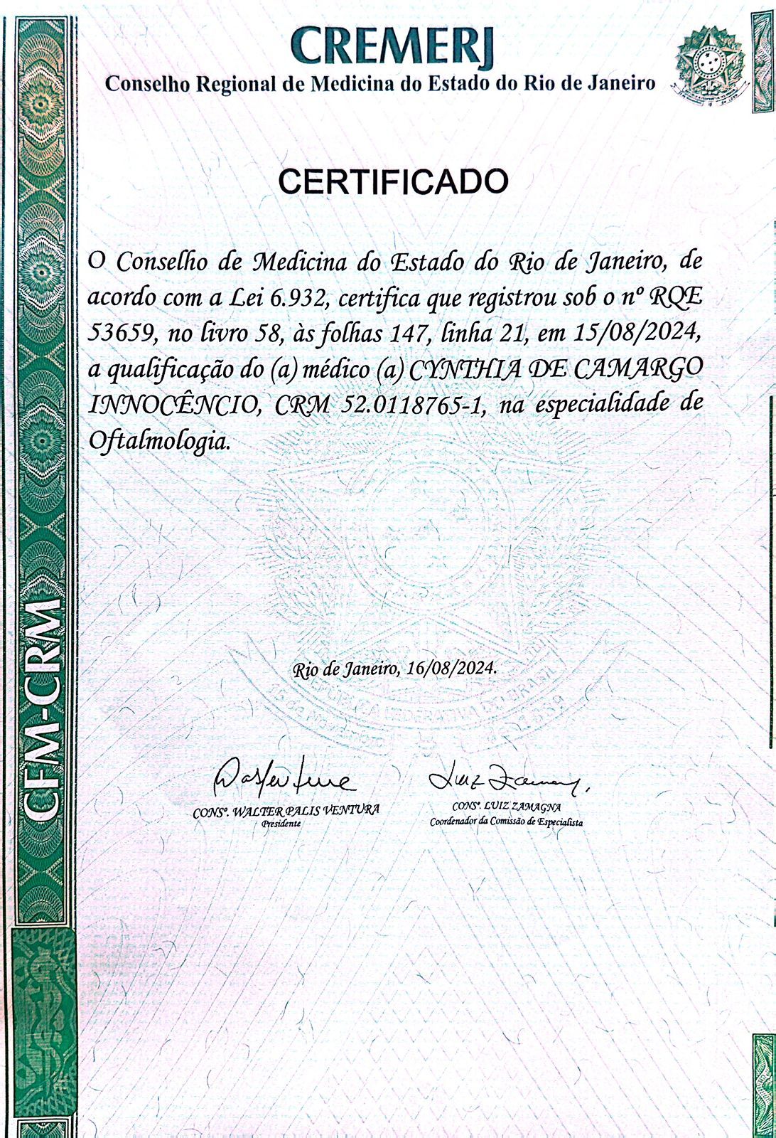 Quais são as principais especialidades de Cynthia De Camargo Innocencio?Cynthia De Camargo Innocencio é oftalmologista. Te mostramos alguns dos serviços oferecidos pelo especialista graças à sua trajetória e vasta experiência: Primeira consulta Oftalmologia, Topografia, Epilação de cilios, Retorno de consultas Oftalmologia, Tonometria, Consulta Oftalmologia, Retirada de corpo estranho da cornea, Curva de Pressão Intraocular, Retinografia, Teleconsulta.