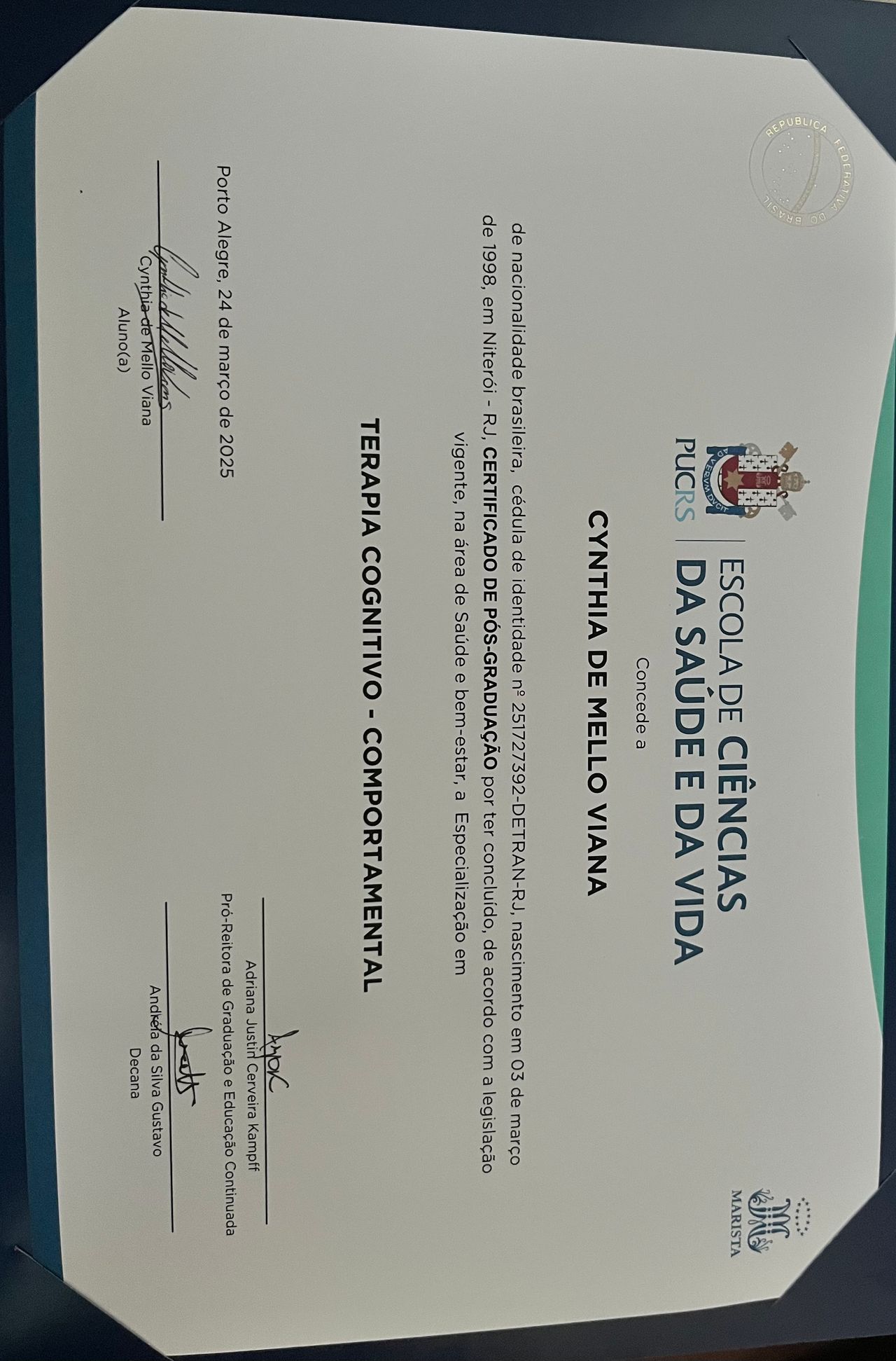 Cynthia é uma profissional incrível. Mudou minha vida pra melhor. Depois que comecei a consultar com ela, mesmo com as adversidades da vida, a minha vida se tornou muito melhor.