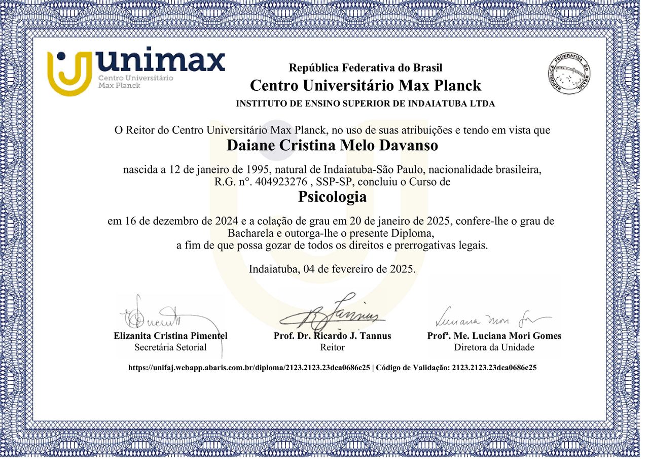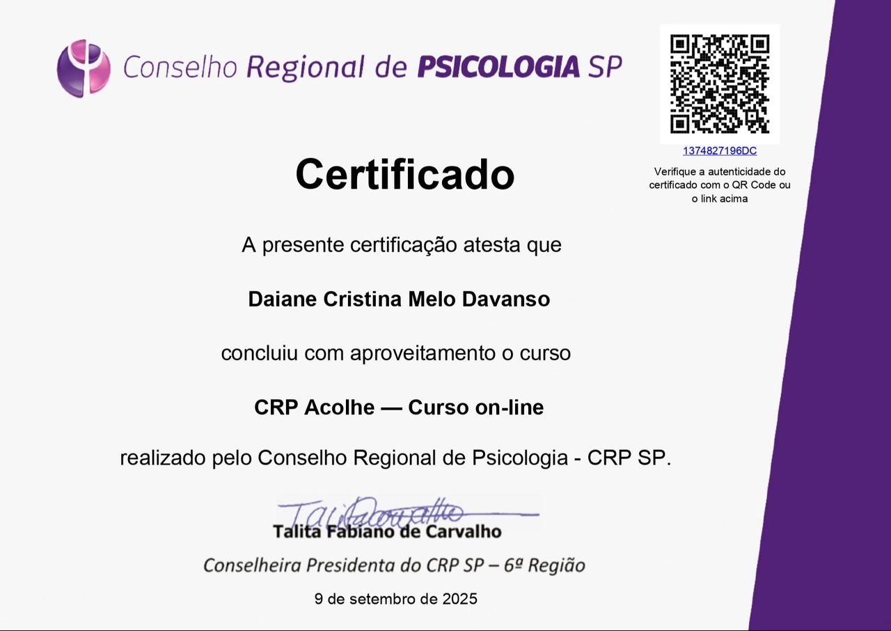 Quando poderia me consultar com Daiane Cristina Melo Davanso?Entre em contato diretamente com Daiane Cristina Melo Davanso para verificar sua disponibilidade.