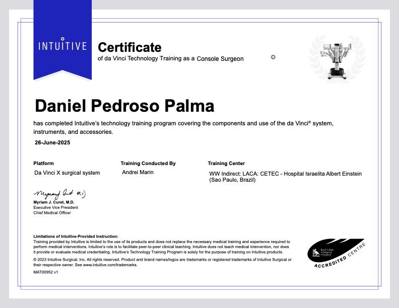 Sou especialista pelo CBCD, com formação em cirurgia minimamente invasiva (videolaparoscopia) e cirurgia robótica pelo sistema Da Vinci.