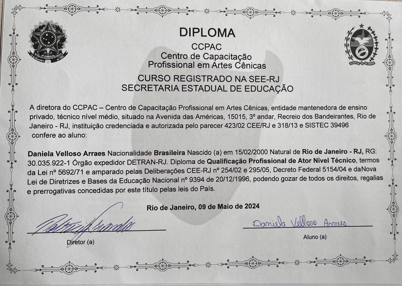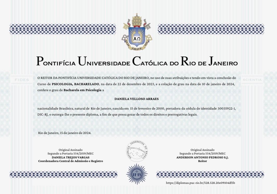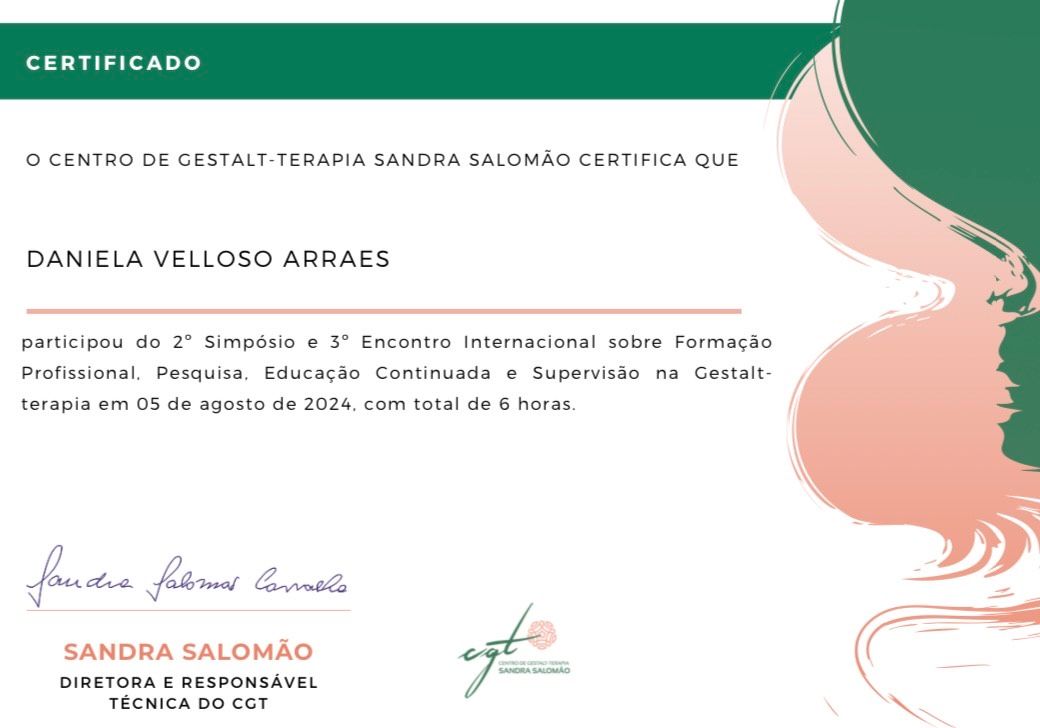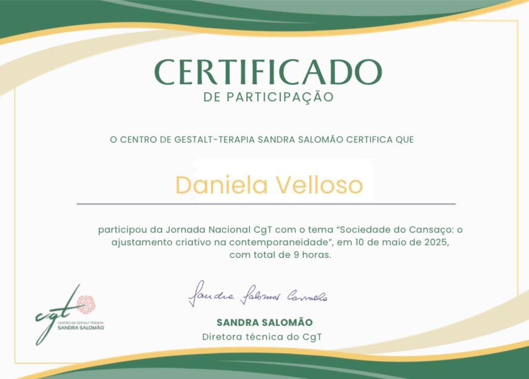 Olá! Meu nome é Daniela Velloso, eu sou psicóloga pela PUC-Rio, especializanda em gestalt terapia pelo Centro de Gestalt Terapia Sandra Salomão e pós-graduanda em "Psicologia e Artes Cênicas: intersecções e práticas" pela Casa das Artes de Laranjeiras.